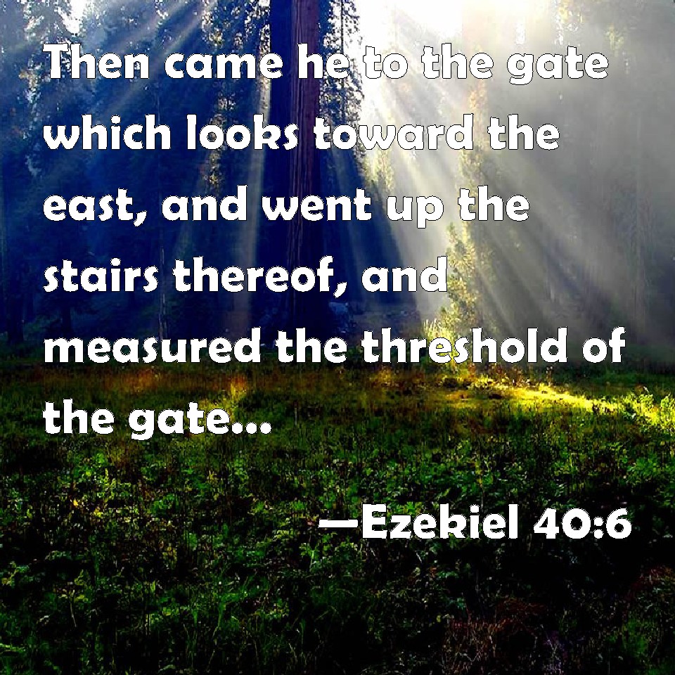 Choose a Background Ezekiel 40:6 Then came he to the gate which looks toward the east, and went up the stairs thereof, and measured the threshold of the gate, which was one reed broad; and the other threshold of the gate, which was one reed broad. KJV: Then came he unto the gate which looketh toward the east, and went up the stairs thereof, and measured the threshold of the gate, which was one reed broad; and the other threshold of the gate, which was one reed broad. DRB: And he came to the gate that looked toward the east, and he went up the steps thereof: and he measured the breadth of the threshold of the gate one reed, that is, one threshold was one reed broad: DBT: And he came to the gate which looked toward the east, and went up its steps; and he measured the threshold of the gate, one reed broad; and the other threshold one reed broad. ERV: Then came he unto the gate which looketh toward the east, and went up the steps thereof; and he measured the threshold of the gate, one reed broad: and the other threshold, one reed broad. WBT: Then he came to the gate which looketh towards the east, and ascended its stairs, and measured the threshhold of the gate, which was one reed broad; and the other threshhold of the gate, which was one reed broad. WEB: Then came he to the gate which looks toward the east, and went up its steps: and he measured the threshold of the gate, one reed broad; and the other threshold, one reed broad. YLT: And he cometh in unto the gate whose front is eastward, and he goeth up by its steps, and he measureth the threshold of the gate one reed broad, even the one threshold one reed broad,Links Ezekiel 40:6 NIV • Ezekiel 40:6 NLT • Ezekiel 40:6 ESV • Ezekiel 40:6 NASB • Ezekiel 40:6 KJV • Ezekiel 40:6 Interlinear • Ezekiel 40:6 Commentaries • Ezekiel 40:6 Parallel Texts • Ezekiel 40:6 Bible Apps • Ezekiel 40:6 Parallel • Bible Hub |
