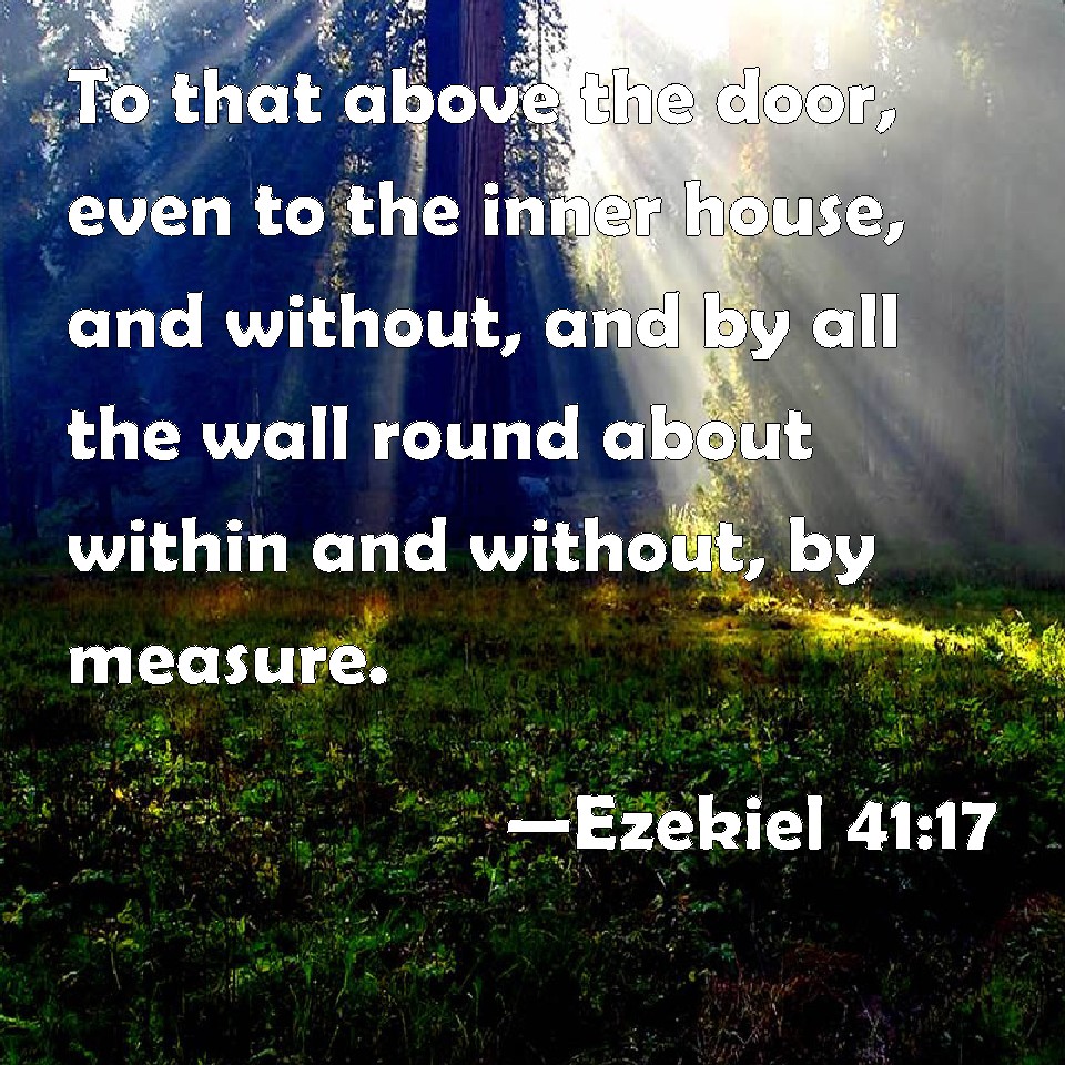 Choose a Background Ezekiel 41:17 To that above the door, even to the inner house, and without, and by all the wall round about within and without, by measure. KJV: To that above the door, even unto the inner house, and without, and by all the wall round about within and without, by measure. DRB: And even to the inner house, and without all the wall round about within and without, by measure. DBT: and above, over the entry, even unto the inner house, and without, and by all the wall round about, within and without, all was by measure. ERV: to the space above the door, even unto the inner house, and without, and by all the wall round about within and without, by measure. WBT: To that above the door, even to the inner house, and without, and by all the wall around within and without, by measure. WEB: to [the space] above the door, even to the inner house, and outside, and by all the wall all around inside and outside, by measure. YLT: over above the opening, and unto the inner-house, and at the outside, and by all the wall all round about within and without by measure.Links Ezekiel 41:17 NIV • Ezekiel 41:17 NLT • Ezekiel 41:17 ESV • Ezekiel 41:17 NASB • Ezekiel 41:17 KJV • Ezekiel 41:17 Interlinear • Ezekiel 41:17 Commentaries • Ezekiel 41:17 Parallel Texts • Ezekiel 41:17 Bible Apps • Ezekiel 41:17 Parallel • Bible Hub |