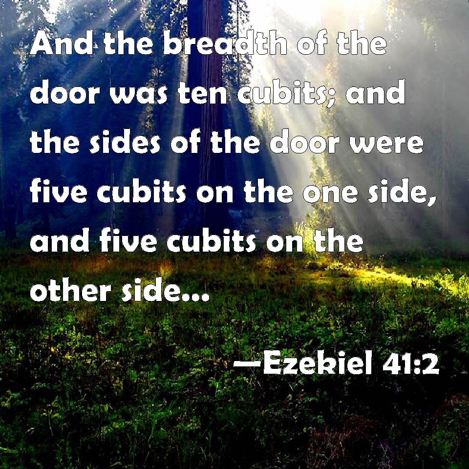 Choose a Background Ezekiel 41:2 And the breadth of the door was ten cubits; and the sides of the door were five cubits on the one side, and five cubits on the other side: and he measured the length thereof, forty cubits: and the breadth, twenty cubits. KJV: And the breadth of the door was ten cubits; and the sides of the door were five cubits on the one side, and five cubits on the other side: and he measured the length thereof, forty cubits: and the breadth, twenty cubits. DRB: And the breadth of the gate was ten cubits: and the sides of the gate five cubits on this side, and five cubits on that side: and he measured the length thereof forty cubits, and the breadth twenty cubits. DBT: And the breadth of the entry was ten cubits, and the sides of the entry were five cubits on this side, and five cubits on that side; and he measured its length, forty cubits, and the breadth, twenty cubits. ERV: And the breadth of the entrance was ten cubits; and the sides of the entrance were five cubits on the one side, and five cubits on the other side: and he measured the length thereof, forty cubits, and the breadth, twenty cubits. WBT: And the breadth of the door was ten cubits; and the sides of the door were five cubits on the one side, and five cubits on the other side: and he measured the length of it forty cubits: and the breadth, twenty cubits. WEB: The breadth of the entrance was ten cubits; and the sides of the entrance were five cubits on the one side, and five cubits on the other side: and he measured its length, forty cubits, and the breadth, twenty cubits. YLT: And the breadth of the opening is ten cubits; and the sides of the opening are five cubits on this side, and five cubits on that side; and he measureth its length forty cubits, and the breadth twenty cubits.Links Ezekiel 41:2 NIV • Ezekiel 41:2 NLT • Ezekiel 41:2 ESV • Ezekiel 41:2 NASB • Ezekiel 41:2 KJV • Ezekiel 41:2 Interlinear • Ezekiel 41:2 Commentaries • Ezekiel 41:2 Parallel Texts • Ezekiel 41:2 Bible Apps • Ezekiel 41:2 Parallel • Bible Hub |