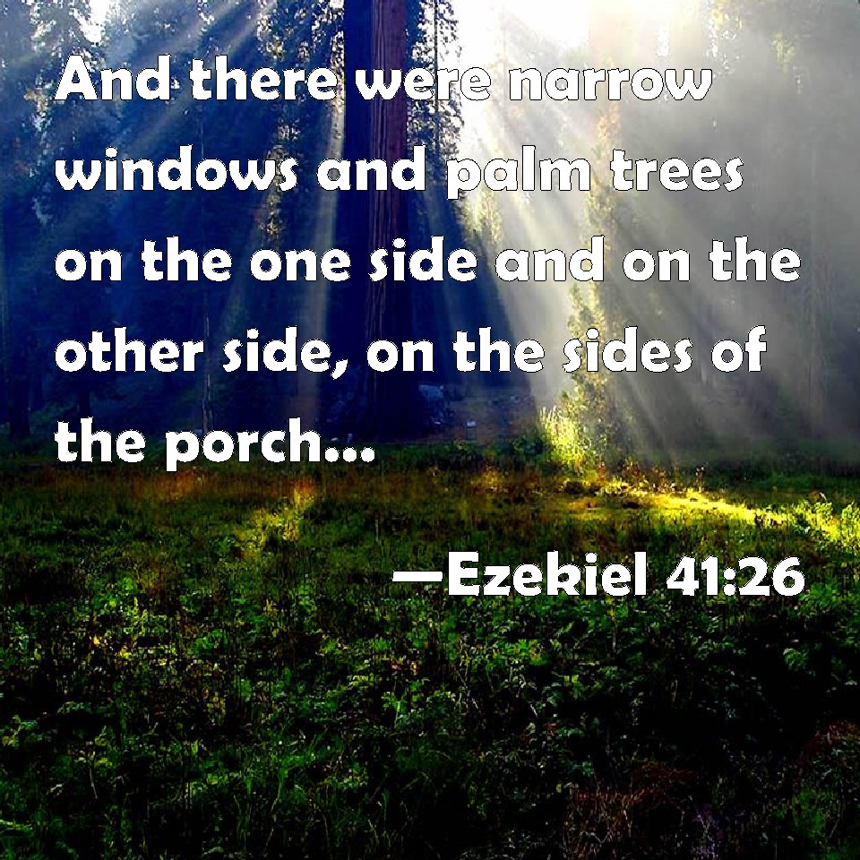 Choose a Background Ezekiel 41:26 And there were narrow windows and palm trees on the one side and on the other side, on the sides of the porch, and on the side chambers of the house, and thick planks. KJV: And there were narrow windows and palm trees on the one side and on the other side, on the sides of the porch, and upon the side chambers of the house, and thick planks. DRB: Upon which were the oblique windows, and the representation of palm trees on this side, and on that side in the sides of the porch, according to the sides of the house, and the breadth of the walls. DBT: and closed windows and palm-trees on the one side and on the other side, on the sides of the porch and the side chambers of the house and the portals. ERV: And there were closed windows and palm trees on the one side and on the other side, on the sides of the porch: thus were the side-chambers of the house, and the thick beams. WBT: And there were narrow windows and palm-trees on the one side and on the other side, on the sides of the porch, and upon the side-chambers of the house, and thick planks. WEB: There were closed windows and palm trees on the one side and on the other side, on the sides of the porch: thus were the side rooms of the house, and the thresholds. YLT: And narrow windows and palm-trees are on this side, and on that side, at the sides of the porch, and the side-chambers of the house, and the thick places.Links Ezekiel 41:26 NIV • Ezekiel 41:26 NLT • Ezekiel 41:26 ESV • Ezekiel 41:26 NASB • Ezekiel 41:26 KJV • Ezekiel 41:26 Interlinear • Ezekiel 41:26 Commentaries • Ezekiel 41:26 Parallel Texts • Ezekiel 41:26 Bible Apps • Ezekiel 41:26 Parallel • Bible Hub |