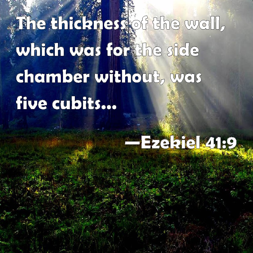 Choose a Background Ezekiel 41:9 The thickness of the wall, which was for the side chamber without, was five cubits: and that which was left was the place of the side chambers that were within. KJV: The thickness of the wall, which was for the side chamber without, was five cubits: and that which was left was the place of the side chambers that were within. DRB: And the thickness of the wall for the side chamber without, which was five cubits: and the inner house was within the side chambers of the house. DBT: The thickness of the wall, which was for the side-chambers without, was five cubits, as also what was left free along the building of the side-chambers that pertained to the house. ERV: The thickness of the wall, which was for the side chambers, on the outside, was five cubits: and that which was left was the place of the side-chambers that belonged to the house. WBT: The thickness of the wall, which was for the side-chamber without, was five cubits: and that which was left was the place of the side-chambers that were within. WEB: The thickness of the wall, which was for the side rooms, on the outside, was five cubits: and that which was left was the place of the side rooms that belonged to the house. YLT: The breadth of the wall that is to the side-chamber at the outside is five cubits; and that which is left is the place of the side-chambers that are to the house.Links Ezekiel 41:9 NIV • Ezekiel 41:9 NLT • Ezekiel 41:9 ESV • Ezekiel 41:9 NASB • Ezekiel 41:9 KJV • Ezekiel 41:9 Interlinear • Ezekiel 41:9 Commentaries • Ezekiel 41:9 Parallel Texts • Ezekiel 41:9 Bible Apps • Ezekiel 41:9 Parallel • Bible Hub |