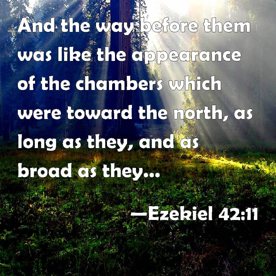 Choose a Background Ezekiel 42:11 And the way before them was like the appearance of the chambers which were toward the north, as long as they, and as broad as they: and all their goings out were both according to their fashions, and according to their doors. KJV: And the way before them was like the appearance of the chambers which were toward the north, as long as they, and as broad as they: and all their goings out were both according to their fashions, and according to their doors. DRB: And the way before them was like the chambers which were toward the north: they wore as long as they, and as broad as they: and all the going is to them, and their fashions, and their doors were alike. DBT: and a passage before them, like the appearance of the cells that were toward the north, according to their length, according to their breadth and all their goings out, and according to their fashions, and according to their doors. ERV: And the way before them was like the appearance of the way of the chambers which were toward the north; according to their length so was their breadth: and all their goings out were both according to their fashions, and according to their doors. WBT: And the way before them was like the appearance of the chambers which were towards the north, as long as they, and as broad as they: and all their goings out were both according to their fashions, and according to their doors. WEB: The way before them was like the appearance of [the way of] the rooms which were toward the north; according to their length so was their breadth: and all their exits were both according to their fashions, and according to their doors. YLT: And the way before them is as the appearance of the chambers that are northward, according to their length so is their breadth, and all their outlets, and according to their fashions, and according to their openings.Links Ezekiel 42:11 NIV • Ezekiel 42:11 NLT • Ezekiel 42:11 ESV • Ezekiel 42:11 NASB • Ezekiel 42:11 KJV • Ezekiel 42:11 Interlinear • Ezekiel 42:11 Commentaries • Ezekiel 42:11 Parallel Texts • Ezekiel 42:11 Bible Apps • Ezekiel 42:11 Parallel • Bible Hub |