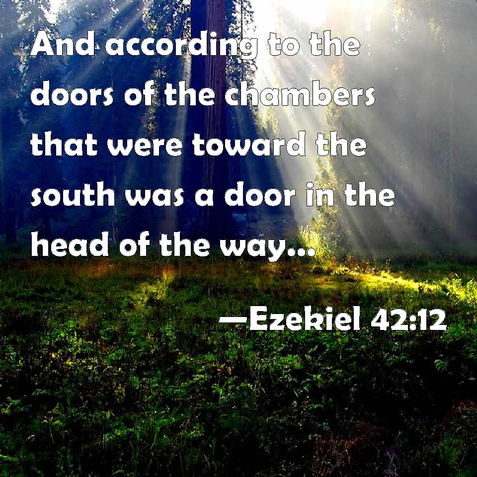 Choose a Background Ezekiel 42:12 And according to the doors of the chambers that were toward the south was a door in the head of the way, even the way directly before the wall toward the east, as one enters into them. KJV: And according to the doors of the chambers that were toward the south was a door in the head of the way, even the way directly before the wall toward the east, as one entereth into them. DRB: According to the doors of the chambers that were towards the south : there was a door in the head of the way, which way was before the porch, separated towards the east as one entereth in. DBT: And according to the doors of the cells that were toward the south there was a door at the head of the way, the way directly before the corresponding wall toward the east as one entereth into them. ERV: And according to the doors of the chambers that were toward the south was a door in the head of the way, even the way directly before the wall toward the east, as one entereth into them. WBT: And according to the doors of the chambers that were towards the south was a door in the head of the way, even the way directly before the wall towards the east, as one entereth into them. WEB: According to the doors of the rooms that were toward the south was a door at the head of the way, even the way directly before the wall toward the east, as one enters into them. YLT: And according to the openings of the chambers that are southward is an opening at the head of the way, the way directly in the front of the wall eastward in entering them.Links Ezekiel 42:12 NIV • Ezekiel 42:12 NLT • Ezekiel 42:12 ESV • Ezekiel 42:12 NASB • Ezekiel 42:12 KJV • Ezekiel 42:12 Interlinear • Ezekiel 42:12 Commentaries • Ezekiel 42:12 Parallel Texts • Ezekiel 42:12 Bible Apps • Ezekiel 42:12 Parallel • Bible Hub |