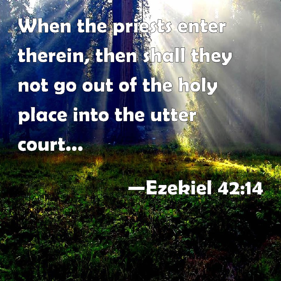 Choose a Background Ezekiel 42:14 When the priests enter therein, then shall they not go out of the holy place into the utter court, but there they shall lay their garments wherein they minister; for they are holy; and shall put on other garments, and shall approach to those things which are for the people. KJV: When the priests enter therein, then shall they not go out of the holy place into the utter court, but there they shall lay their garments wherein they minister; for they are holy; and shall put on other garments, and shall approach to those things which are for the people. DRB: And when the priests shall have entered in, they shall not go out of the holy places into the outward court: but there they shall lay their vestments, wherein they minister, for they are holy: and they shall put on other garments, and so they shall go forth to the people. DBT: When the priests enter in, they shall not go forth from the sanctuary into the outer court, but there they shall lay their garments wherein they minister, for they are holy; and they shall put on other garments, and shall approach to that which is for the people. ERV: When the priests enter in, then shall they not go out of the holy place into the outer court, but there they shall lay their garments wherein they minister; for they are holy: and they shall put on other garments, and shall approach to that which pertaineth to the people. WBT: When the priests enter therein, then shall they not go out of the holy place into the outer court, but there they shall lay their garments in which they minister; for they are holy; and shall put on other garments, and shall approach to those things which are for the people. WEB: When the priests enter in, then shall they not go out of the holy place into the outer court, but there they shall lay their garments in which they minister; for they are holy: and they shall put on other garments, and shall approach to that which pertains to the people. YLT: In the priests' going in, they come not out from the sanctuary unto the outer court, and there they place their garments with which they minister, for they are holy, and have put on other garments, and have drawn near unto that which is for the people.'Links Ezekiel 42:14 NIV • Ezekiel 42:14 NLT • Ezekiel 42:14 ESV • Ezekiel 42:14 NASB • Ezekiel 42:14 KJV • Ezekiel 42:14 Interlinear • Ezekiel 42:14 Commentaries • Ezekiel 42:14 Parallel Texts • Ezekiel 42:14 Bible Apps • Ezekiel 42:14 Parallel • Bible Hub |