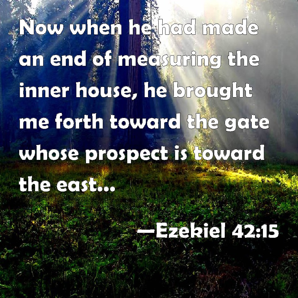 Choose a Background Ezekiel 42:15 Now when he had made an end of measuring the inner house, he brought me forth toward the gate whose prospect is toward the east, and measured it round about. KJV: Now when he had made an end of measuring the inner house, he brought me forth toward the gate whose prospect is toward the east, and measured it round about. DRB: Now when he had made an end of measuring the inner house, he brought me out by the way of the gate that looked toward the east: and he measured it on every side round about. DBT: And when he had made an end of measuring the inner house, he brought me forth toward the gate whose front was toward the east, and measured the enclosure round about. ERV: Now when he had made an end of measuring the inner house, he brought me forth by the way of the gate whose prospect is toward the east, and measured it round about. WBT: Now when he had made an end of measuring the inner house, he brought me forth towards the gate whose prospect is towards the east, and measured it around. WEB: Now when he had made an end of measuring the inner house, he brought me forth by the way of the gate whose prospect is toward the east, and measured it all around. YLT: And he hath finished the measurements of the inner house, and hath brought me forth the way of the gate whose front is eastward, and he hath measured it all round about.Links Ezekiel 42:15 NIV • Ezekiel 42:15 NLT • Ezekiel 42:15 ESV • Ezekiel 42:15 NASB • Ezekiel 42:15 KJV • Ezekiel 42:15 Interlinear • Ezekiel 42:15 Commentaries • Ezekiel 42:15 Parallel Texts • Ezekiel 42:15 Bible Apps • Ezekiel 42:15 Parallel • Bible Hub |