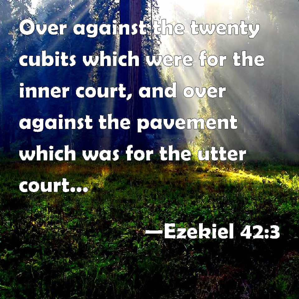 Choose a Background Ezekiel 42:3 Over against the twenty cubits which were for the inner court, and over against the pavement which was for the utter court, was gallery against gallery in three stories. KJV: Over against the twenty cubits which were for the inner court, and over against the pavement which was for the utter court, was gallery against gallery in three stories. DRB: Over against the twenty cubits of the inner court, and over against the pavement of the outward court that was paved with stone, where there was a gallery joined to a triple gallery. DBT: over against the twenty cubits that pertained to the inner court, and over against the pavement that pertained to the outer court; there was gallery against gallery in the third story; ERV: Over against the twenty cubits which belonged to the inner court, and over against the pavement which belonged to the outer court, was gallery against gallery in the third story. WBT: Over against the twenty cubits which were for the inner court, and over against the pavement which was for the outer court, was gallery against gallery in three stories. WEB: Over against the twenty [cubits] which belonged to the inner court, and over against the pavement which belonged to the outer court, was gallery against gallery in the third story. YLT: Over-against the twenty cubits that are to the inner court, and over-against the pavement that is to the outer court, is gallery over-against gallery, in the three storeys.Links Ezekiel 42:3 NIV • Ezekiel 42:3 NLT • Ezekiel 42:3 ESV • Ezekiel 42:3 NASB • Ezekiel 42:3 KJV • Ezekiel 42:3 Interlinear • Ezekiel 42:3 Commentaries • Ezekiel 42:3 Parallel Texts • Ezekiel 42:3 Bible Apps • Ezekiel 42:3 Parallel • Bible Hub |