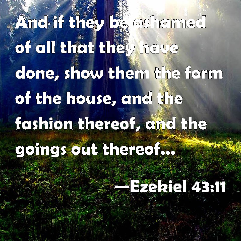 Choose a Background Ezekiel 43:11 And if they be ashamed of all that they have done, show them the form of the house, and the fashion thereof, and the goings out thereof, and the comings in thereof, and all the forms thereof, and all the ordinances thereof, and all the forms thereof, and all the laws thereof: and write it in their sight, that they may keep the whole form thereof, and all the ordinances thereof, and do them. KJV: And if they be ashamed of all that they have done, shew them the form of the house, and the fashion thereof, and the goings out thereof, and the comings in thereof, and all the forms thereof, and all the ordinances thereof, and all the forms thereof, and all the laws thereof: and write it in their sight, that they may keep the whole form thereof, and all the ordinances thereof, and do them. DRB: And be ashamed of all that they have done. Shew them the form of the house, and of the fashion thereof, the goings out and the comings in, and the whole plan thereof, and all its ordinances, and all its order, and all its laws, and thou shalt write it in their sight: that they may keep the whole form thereof, and its ordinances, and do them. DBT: And if they be confounded at all that they have done, make known to them the form of the house, and its fashion, and its goings out, and its comings in, and all its forms, and all its statutes, yea, all the forms thereof, and all the laws thereof; and write it in their sight, that they may keep the whole form thereof, and all the statutes thereof, and do them. ERV: And if they be ashamed of all that they have done, make known unto them the form of the house, and the fashion thereof, and the goings out thereof, and the comings in thereof, and all the forms thereof, and all the ordinances thereof, and all the forms thereof, and all the laws thereof, and write it in their sight: that they may keep the whole form thereof, and all the ordinances thereof, and do them. WBT: And if they shall be ashamed of all that they have done, show them the form of the house, and the fashion of it, and its goings out, and its comings in, and all its forms, and all its ordinances, and all its forms, and all its laws: and write it in their sight, that they may keep the whole form of it, and all its ordinances, and do them. WEB: If they be ashamed of all that they have done, make known to them the form of the house, and its fashion, and its exits, and its entrances, and all its forms, and all its ordinances, and all its forms, and all its laws; and write it in their sight; that they may keep the whole form of it, and all its ordinances, and do them. YLT: And since they have been ashamed of all that they have done, The form of the house, and its measurement, And its outlets, and its inlets, and all its forms, And all its statutes, even all its forms, And all its laws cause them to know, And write it before their eyes, And they observe all its forms, And all its statutes, and have done them.Links Ezekiel 43:11 NIV • Ezekiel 43:11 NLT • Ezekiel 43:11 ESV • Ezekiel 43:11 NASB • Ezekiel 43:11 KJV • Ezekiel 43:11 Interlinear • Ezekiel 43:11 Commentaries • Ezekiel 43:11 Parallel Texts • Ezekiel 43:11 Bible Apps • Ezekiel 43:11 Parallel • Bible Hub |