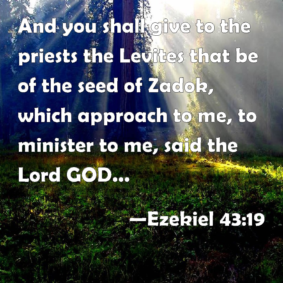 Choose a Background Ezekiel 43:19 And you shall give to the priests the Levites that be of the seed of Zadok, which approach to me, to minister to me, said the Lord GOD, a young bullock for a sin offering. KJV: And thou shalt give to the priests the Levites that be of the seed of Zadok, which approach unto me, to minister unto me, saith the Lord GOD, a young bullock for a sin offering. DRB: And thou shalt give to the priests, and the Levites, that are of the race of Sadoc, who approach to me, saith the Lord God, to offer to me a calf of the herd for sin. DBT: And thou shalt give to the priests the Levites that are of the seed of Zadok, who come near unto me, to minister unto me, saith the Lord Jehovah, a young bullock for a sin-offering. ERV: Thou shalt give to the priests the Levites that be of the seed of Zadok, which are near unto me, to minister unto me, saith the Lord GOD, a young bullock for a sin offering. WBT: And thou shalt give to the priests the Levites that are of the seed of Zadok, who approach to me, to minister to me, saith the Lord GOD, a young bullock for a sin-offering. WEB: You shall give to the priests the Levites who are of the seed of Zadok, who are near to me, to minister to me, says the Lord Yahweh, a young bull for a sin offering. YLT: And thou hast given unto the priests, the Levites, who are of the seed of Zadok — who are near unto Me, an affirmation of the Lord Jehovah, to serve Me — a calf from the herd, for a sin-offering.Links Ezekiel 43:19 NIV • Ezekiel 43:19 NLT • Ezekiel 43:19 ESV • Ezekiel 43:19 NASB • Ezekiel 43:19 KJV • Ezekiel 43:19 Interlinear • Ezekiel 43:19 Commentaries • Ezekiel 43:19 Parallel Texts • Ezekiel 43:19 Bible Apps • Ezekiel 43:19 Parallel • Bible Hub |