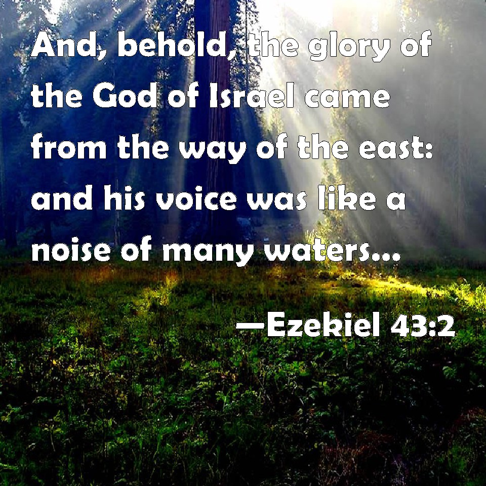 Choose a Background Ezekiel 43:2 And, behold, the glory of the God of Israel came from the way of the east: and his voice was like a noise of many waters: and the earth shined with his glory. KJV: And, behold, the glory of the God of Israel came from the way of the east: and his voice was like a noise of many waters: and the earth shined with his glory. DRB: And behold the glory of the God of Israel came in by the way of the east: and his voice was like the noise of many waters, and the earth shone with his majesty. DBT: And behold, the glory of the God of Israel came from the way of the east; and his voice was like the voice of many waters; and the earth was lit up with his glory. ERV: And behold, the glory of the God of Israel came from the way of the east: and his voice was like the sound of many waters: and the earth shined with his glory. WBT: And behold, the glory of the God of Israel came from the way of the east: and his voice was like a noise of many waters: and the earth shined with his glory. WEB: Behold, the glory of the God of Israel came from the way of the east: and his voice was like the sound of many waters; and the earth shined with his glory. YLT: And lo, the honour of the God of Israel hath come from the way of the east, and His voice is as the noise of many waters, and the earth hath shone from His honour.Links Ezekiel 43:2 NIV • Ezekiel 43:2 NLT • Ezekiel 43:2 ESV • Ezekiel 43:2 NASB • Ezekiel 43:2 KJV • Ezekiel 43:2 Interlinear • Ezekiel 43:2 Commentaries • Ezekiel 43:2 Parallel Texts • Ezekiel 43:2 Bible Apps • Ezekiel 43:2 Parallel • Bible Hub |