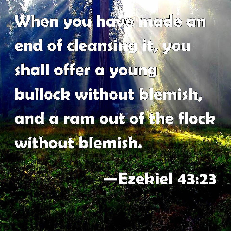 Choose a Background Ezekiel 43:23 When you have made an end of cleansing it, you shall offer a young bullock without blemish, and a ram out of the flock without blemish. KJV: When thou hast made an end of cleansing it, thou shalt offer a young bullock without blemish, and a ram out of the flock without blemish. DRB: And when thou shalt have made an end of the expiation thereof, thou shalt offer a calf of the herd without blemish, and a ram of the flock without blemish. DBT: When thou hast ended purging it, thou shalt present a young bullock without blemish, and a ram out of the flock without blemish; ERV: When thou hast made an end of cleansing it, thou shalt offer a young bullock without blemish, and a ram out of the flock without blemish. WBT: When thou hast made an end of cleansing it, thou shalt offer a young bullock without blemish, and a ram out of the flock without blemish. WEB: When you have finished cleansing it, you shall offer a young bull without blemish, and a ram out of the flock without blemish. YLT: In thy finishing cleansing, thou dost bring near a calf, a son of the herd, a perfect one, and a ram out of the flock, a perfect one.Links Ezekiel 43:23 NIV • Ezekiel 43:23 NLT • Ezekiel 43:23 ESV • Ezekiel 43:23 NASB • Ezekiel 43:23 KJV • Ezekiel 43:23 Interlinear • Ezekiel 43:23 Commentaries • Ezekiel 43:23 Parallel Texts • Ezekiel 43:23 Bible Apps • Ezekiel 43:23 Parallel • Bible Hub |