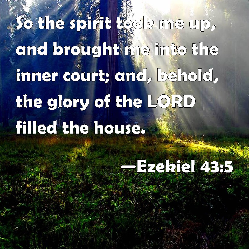 Choose a Background Ezekiel 43:5 So the spirit took me up, and brought me into the inner court; and, behold, the glory of the LORD filled the house. KJV: So the spirit took me up, and brought me into the inner court; and, behold, the glory of the LORD filled the house. DRB: And the spirit lifted me up and brought me into the inner court: and behold the house was filled with the glory of the Lord. DBT: And the Spirit lifted me up, and brought me into the inner court; and behold, the glory of Jehovah filled the house. ERV: And the spirit took me up, and brought me into the inner court; and behold, the glory of the LORD filled the house. WBT: So the spirit took me up, and brought me into the inner court; and behold, the glory of the LORD filled the house. WEB: The Spirit took me up, and brought me into the inner court; and behold, the glory of Yahweh filled the house. YLT: And take me up doth the Spirit, and bringeth me in unto the inner court, and lo, the honour of Jehovah hath filled the house.Links Ezekiel 43:5 NIV • Ezekiel 43:5 NLT • Ezekiel 43:5 ESV • Ezekiel 43:5 NASB • Ezekiel 43:5 KJV • Ezekiel 43:5 Interlinear • Ezekiel 43:5 Commentaries • Ezekiel 43:5 Parallel Texts • Ezekiel 43:5 Bible Apps • Ezekiel 43:5 Parallel • Bible Hub |