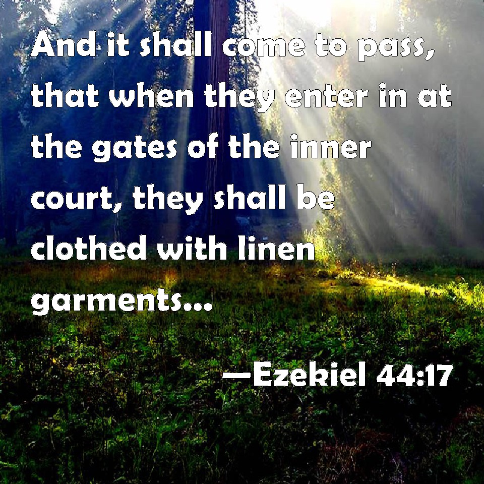 Choose a Background Ezekiel 44:17 And it shall come to pass, that when they enter in at the gates of the inner court, they shall be clothed with linen garments; and no wool shall come on them, whiles they minister in the gates of the inner court, and within. KJV: And it shall come to pass, that when they enter in at the gates of the inner court, they shall be clothed with linen garments; and no wool shall come upon them, whiles they minister in the gates of the inner court, and within. DRB: And when they shall enter in at the gates of the inner court, they shall be clothed with linen garments: neither shall any woollen come upon them, when they minister in the gates of the inner court and within. DBT: And it shall come to pass when they enter in at the gates of the inner court, they shall be clothed with linen garments; and no wool shall come upon them, when they minister in the gates of the inner court, and towards the house. ERV: And it shall be that when they enter in at the gates of the inner court, they shall be clothed with linen garments; and no wool shall come upon them, whiles they minister in the gates of the inner court, and within. WBT: And it shall come to pass, that when they enter in at the gates of the inner court, they shall be clothed with linen garments; and no wool shall come upon them, while they minister in the gates of the inner court, and within. WEB: It shall be that, when they enter in at the gates of the inner court, they shall be clothed with linen garments; and no wool shall come on them, while they minister in the gates of the inner court, and within. YLT: And it hath come to pass, in their going in unto the gates of the inner court, linen garments they put on; and no wool cometh up on them in their ministering in the gates of the inner court and within.Links Ezekiel 44:17 NIV • Ezekiel 44:17 NLT • Ezekiel 44:17 ESV • Ezekiel 44:17 NASB • Ezekiel 44:17 KJV • Ezekiel 44:17 Interlinear • Ezekiel 44:17 Commentaries • Ezekiel 44:17 Parallel Texts • Ezekiel 44:17 Bible Apps • Ezekiel 44:17 Parallel • Bible Hub |