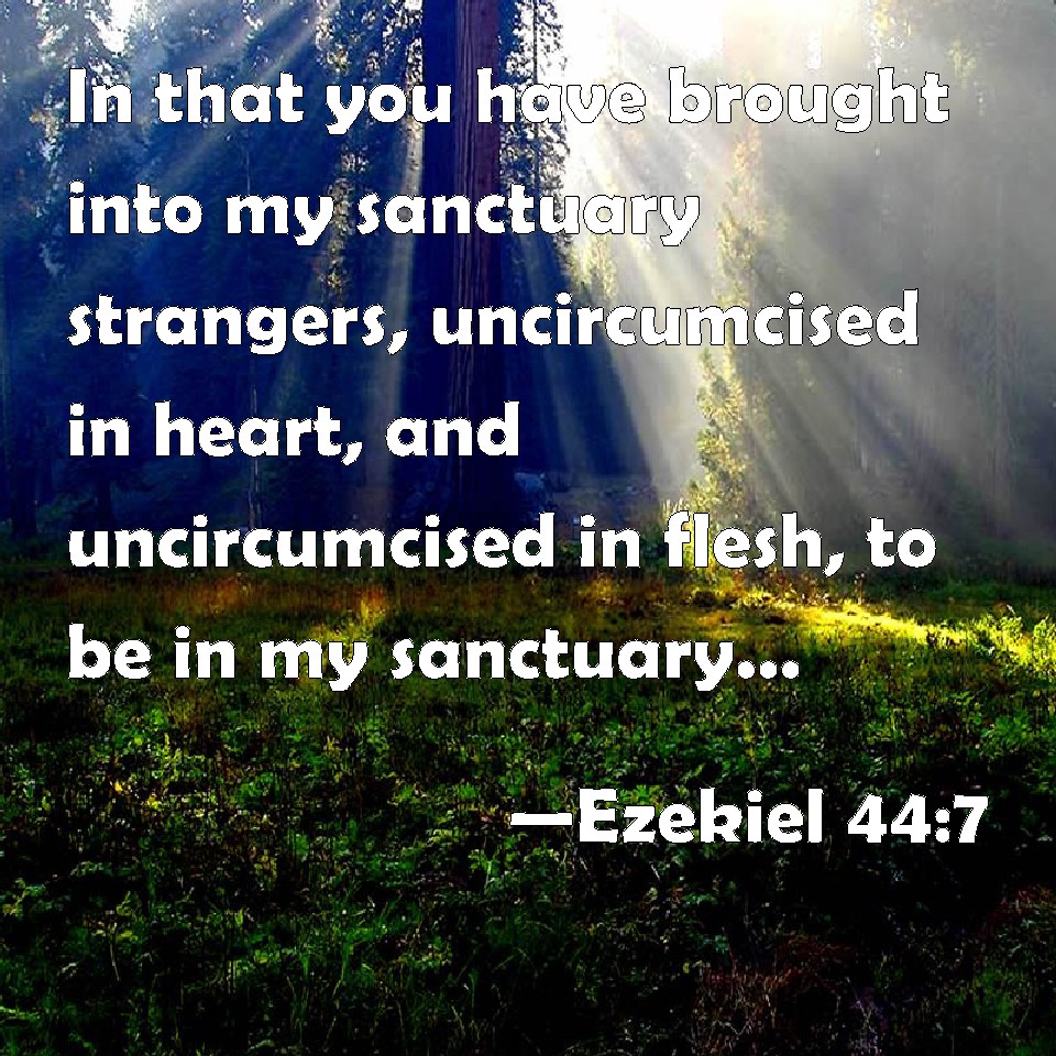 Choose a Background Ezekiel 44:7 In that you have brought into my sanctuary strangers, uncircumcised in heart, and uncircumcised in flesh, to be in my sanctuary, to pollute it, even my house, when you offer my bread, the fat and the blood, and they have broken my covenant because of all your abominations. KJV: In that ye have brought into my sanctuary strangers, uncircumcised in heart, and uncircumcised in flesh, to be in my sanctuary, to pollute it, even my house, when ye offer my bread, the fat and the blood, and they have broken my covenant because of all your abominations. DRB: In that you have brought in strangers uncircumcised in heart, and uncircumcised in flesh, to be in my sanctuary, and to defile my house: and you offer my bread, the fat, and the blood: and you have broken my covenant by all your wicked doings. DBT: in that ye have brought strangers, uncircumcised in heart and uncircumcised in flesh, to be in my sanctuary, to profane it, even my house, when ye offered my bread, the fat and the blood; and they have broken my covenant besides all your abominations. ERV: in that ye have brought in aliens, uncircumcised in heart and uncircumcised in flesh, to be in my sanctuary, to profane it, even my house, when ye offer my bread, the fat and the blood, and they have broken my covenant, to add unto all your abominations. WBT: In that ye have brought into my sanctuary strangers, uncircumcised in heart, and uncircumcised in flesh, to be in my sanctuary, to pollute it, even my house, when ye offer my bread, the fat and the blood, and they have broken my covenant because of all your abominations. WEB: in that you have brought in foreigners, uncircumcised in heart and uncircumcised in flesh, to be in my sanctuary, to profane it, even my house, when you offer my bread, the fat and the blood, and they have broken my covenant, [to add] to all your abominations. YLT: In your bringing in sons of a stranger, uncircumcised of heart, and uncircumcised of flesh, to be in My sanctuary, to pollute it, even My house, in your bringing near My bread, fat, and blood, and they break My covenant by all your abominations,Links Ezekiel 44:7 NIV • Ezekiel 44:7 NLT • Ezekiel 44:7 ESV • Ezekiel 44:7 NASB • Ezekiel 44:7 KJV • Ezekiel 44:7 Interlinear • Ezekiel 44:7 Commentaries • Ezekiel 44:7 Parallel Texts • Ezekiel 44:7 Bible Apps • Ezekiel 44:7 Parallel • Bible Hub |