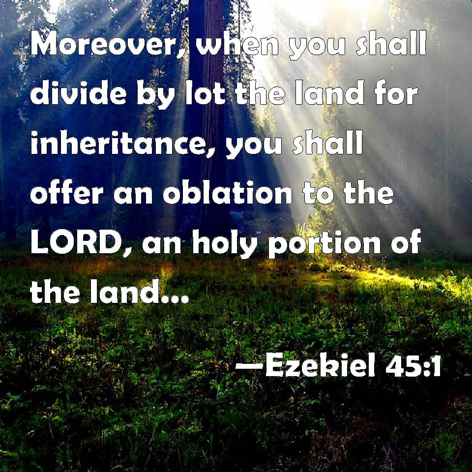 Choose a Background Ezekiel 45:1 Moreover, when you shall divide by lot the land for inheritance, you shall offer an oblation to the LORD, an holy portion of the land: the length shall be the length of five and twenty thousand reeds, and the breadth shall be ten thousand. This shall be holy in all the borders thereof round about. KJV: Moreover, when ye shall divide by lot the land for inheritance, ye shall offer an oblation unto the LORD, an holy portion of the land: the length shall be the length of five and twenty thousand reeds, and the breadth shall be ten thousand. This shall be holy in all the borders thereof round about. DRB: And when you shall begin to divide the land by lot, separate ye firstfruits to the Lord, a portion of the land to be holy, in length twenty-five thousand and in breadth ten thousand: it shall be holy in all the borders thereof round about. DBT: And when ye shall divide by lot the land for inheritance, ye shall offer a heave-offering unto Jehovah, a holy portion of the land: the length shall be the length of five and twenty thousand cubits, and the breadth ten thousand. This shall be holy in all the borders thereof round about. ERV: Moreover, when ye shall divide by lot the land for inheritance, ye shall offer an oblation unto the LORD, an holy portion of the land: the length shall be the length of five and twenty thousand reeds, and the breadth shall be ten thousand: it shall be holy in all the border thereof round about. WBT: Moreover, when ye shall divide by lot the land for inheritance, ye shall offer an oblation to the LORD, a holy portion of the land: the length shall be the length of five and twenty thousand reeds, and the breadth shall be ten thousand. This shall be holy in all its borders on every side. WEB: Moreover, when you shall divide by lot the land for inheritance, you shall offer an offering to Yahweh, a holy portion of the land; the length shall be the length of twenty-five thousand [reeds], and the breadth shall be ten thousand: it shall be holy in all its border all around. YLT: And in your causing the land to fall in inheritance, ye lift up a heave-offering to Jehovah, a holy portion of the land: the length — five and twenty thousand is the length, and the breadth ten thousand; it is holy in all its border round about.Links Ezekiel 45:1 NIV • Ezekiel 45:1 NLT • Ezekiel 45:1 ESV • Ezekiel 45:1 NASB • Ezekiel 45:1 KJV • Ezekiel 45:1 Interlinear • Ezekiel 45:1 Commentaries • Ezekiel 45:1 Parallel Texts • Ezekiel 45:1 Bible Apps • Ezekiel 45:1 Parallel • Bible Hub |