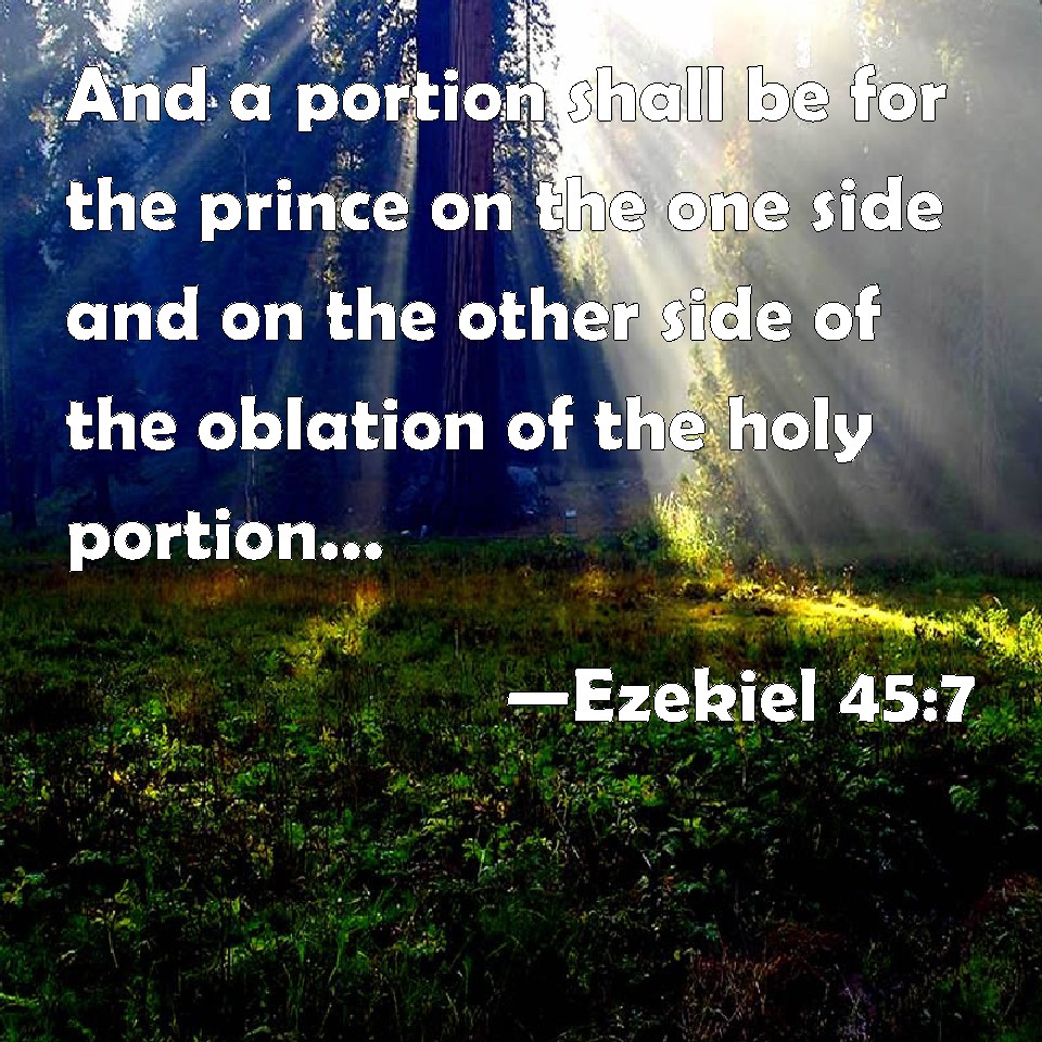 Ezekiel 45:7 And a portion shall be for the prince on the one side and on the other side of the oblation of the holy portion, and of the possession of the city, before the oblation of the holy portion, and before the possession of the city, from the west side westward, and from the east side eastward: and the length shall be over against one of the portions, from the west border to the east border.