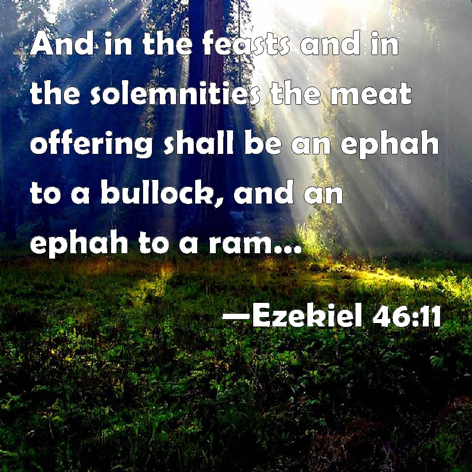 Choose a Background Ezekiel 46:11 And in the feasts and in the solemnities the meat offering shall be an ephah to a bullock, and an ephah to a ram, and to the lambs as he is able to give, and an hin of oil to an ephah. KJV: And in the feasts and in the solemnities the meat offering shall be an ephah to a bullock, and an ephah to a ram, and to the lambs as he is able to give, and an hin of oil to an ephah. DRB: And in the fairs, and in the solemnities there shall be the sacrifice of an ephi to a calf, and an ephi to a ram: and to the lambs, the sacrifice shall be as his hand shall find: and a hin of oil to every ephi. DBT: And on the feast-days, and in the solemnities, the oblation shall be an ephah for a bullock and an ephah for a ram, and for the lambs as he is able to give; and oil, a hin for an ephah. ERV: And in the feasts and in the solemnities the meal offering shall be an ephah for a bullock, and an ephah for a ram, and for the lambs as he is able to give, and an hin of oil to an ephah. WBT: And in the feasts and in the solemnities the meat-offering shall be an ephah to a bullock, and an ephah to a ram, and to the lambs as he is able to give, and a hin of oil to an ephah. WEB: In the feasts and in the solemnities the meal offering shall be an ephah for a bull, and an ephah for a ram, and for the lambs as he is able to give, and a hin of oil to an ephah. YLT: 'And in feasts, and in appointed times, the present is an ephah for a bullock, and an ephah for a ram, and for lambs the gift of his hand, and of oil a hin for an ephah.Links Ezekiel 46:11 NIV • Ezekiel 46:11 NLT • Ezekiel 46:11 ESV • Ezekiel 46:11 NASB • Ezekiel 46:11 KJV • Ezekiel 46:11 Interlinear • Ezekiel 46:11 Commentaries • Ezekiel 46:11 Parallel Texts • Ezekiel 46:11 Bible Apps • Ezekiel 46:11 Parallel • Bible Hub |