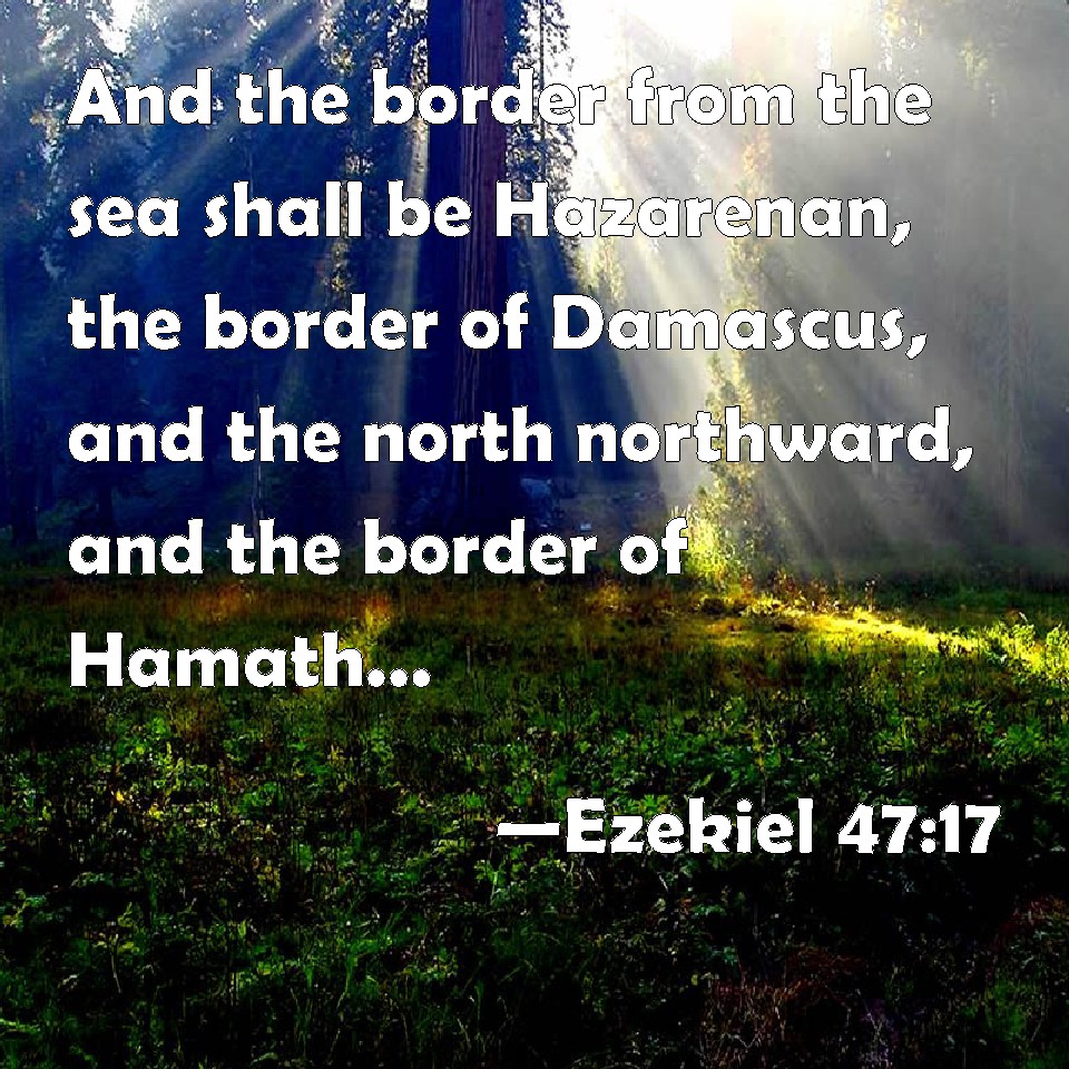 Choose a Background Ezekiel 47:17 And the border from the sea shall be Hazarenan, the border of Damascus, and the north northward, and the border of Hamath. And this is the north side. KJV: And the border from the sea shall be Hazarenan, the border of Damascus, and the north northward, and the border of Hamath. And this is the north side. DRB: And the border from the sea even to the court of Enan, shall be the border of Damascus, and from the north to the north: the border of Emath, this is the north side. DBT: And the border from the sea shall be Hazar-enan, the border of Damascus, and the north northward, and the border of Hamath: this is the north side. ERV: And the border from the sea shall be Hazar-enon at the border of Damascus, and on the north northward is the border of Hamath. This is the north side. WBT: And the border from the sea shall be Hazar-enan, the border of Damascus, and the north northward, and the border of Hamath. And this is the north side. WEB: The border from the sea, shall be Hazar Enon at the border of Damascus; and on the north northward is the border of Hamath. This is the north side. YLT: And the border from the sea hath been Hazar-Enan, the border of Damascus, and Zaphon at the north, and the border of Hamath: and this is the north quarter.Links Ezekiel 47:17 NIV • Ezekiel 47:17 NLT • Ezekiel 47:17 ESV • Ezekiel 47:17 NASB • Ezekiel 47:17 KJV • Ezekiel 47:17 Interlinear • Ezekiel 47:17 Commentaries • Ezekiel 47:17 Parallel Texts • Ezekiel 47:17 Bible Apps • Ezekiel 47:17 Parallel • Bible Hub |
