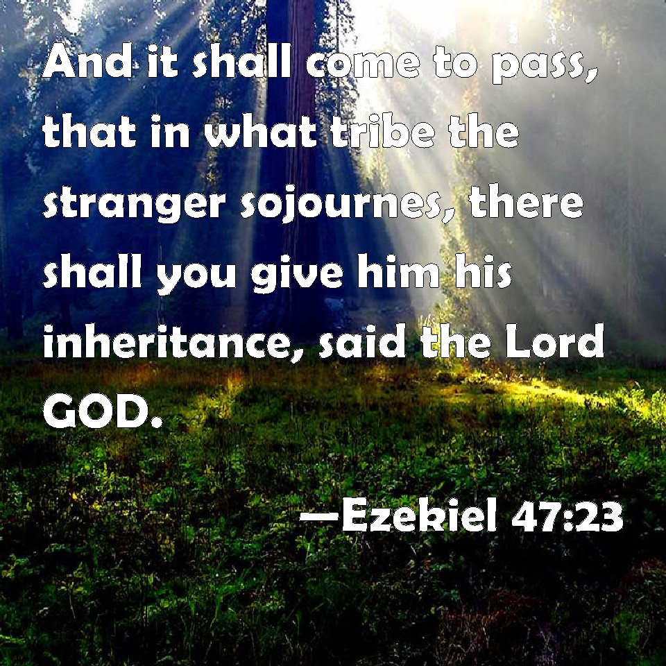 Choose a Background Ezekiel 47:23 And it shall come to pass, that in what tribe the stranger sojournes, there shall you give him his inheritance, said the Lord GOD. KJV: And it shall come to pass, that in what tribe the stranger sojourneth, there shall ye give him his inheritance, saith the Lord GOD. DRB: And in what tribe soever the stranger shall be, there shall you give him possession, saith the Lord God. DBT: And it shall come to pass that in the tribe in which the stranger sojourneth, there shall ye give him his inheritance, saith the Lord Jehovah. ERV: And it shall come to pass, that in what tribe the stranger sojourneth; there shall ye give him his inheritance, saith the Lord GOD. WBT: And it shall come to pass, that in what tribe the stranger sojourneth, there shall ye give him his inheritance, saith the Lord GOD. WEB: It shall happen, that in what tribe the stranger lives, there you shall give him his inheritance, says the Lord Yahweh. YLT: And it hath come to pass, in the tribe with which the sojourner sojourneth, there ye give his inheritance — an affirmation of the Lord Jehovah.Links Ezekiel 47:23 NIV • Ezekiel 47:23 NLT • Ezekiel 47:23 ESV • Ezekiel 47:23 NASB • Ezekiel 47:23 KJV • Ezekiel 47:23 Interlinear • Ezekiel 47:23 Commentaries • Ezekiel 47:23 Parallel Texts • Ezekiel 47:23 Bible Apps • Ezekiel 47:23 Parallel • Bible Hub |