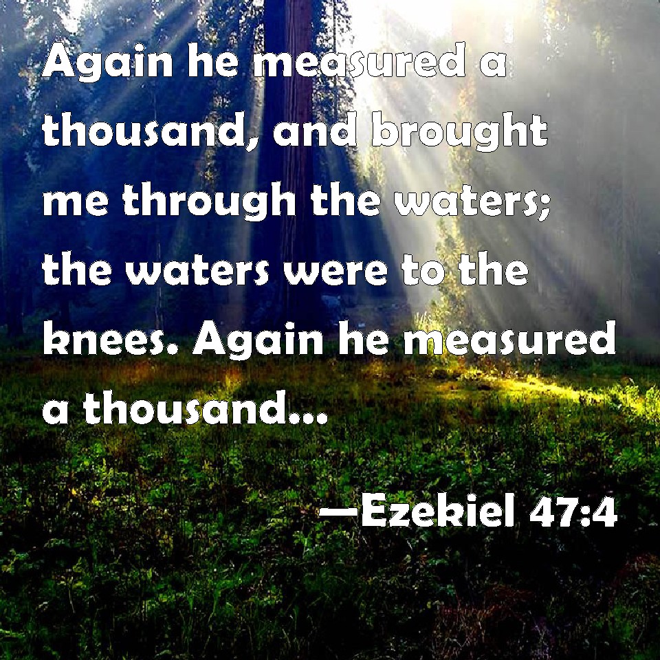 Choose a Background Ezekiel 47:4 Again he measured a thousand, and brought me through the waters; the waters were to the knees. Again he measured a thousand, and brought me through; the waters were to the loins. KJV: Again he measured a thousand, and brought me through the waters; the waters were to the knees. Again he measured a thousand, and brought me through; the waters were to the loins. DRB: And again he measured a thousand, and he brought me through the water up to the knees. DBT: And he measured a thousand cubits, and caused me to pass through the waters: the waters were to the knees. And he measured a thousand and caused me to pass through: the waters were to the loins. ERV: Again he measured a thousand, and caused me to pass through the waters, waters that were to the knees. Again he measured a thousand, and caused me to pass through the waters, waters that were to the loins. WBT: Again he measured a thousand, and brought me through the waters; the waters were to the knees. Again he measured a thousand, and brought me through; the waters were to the loins. WEB: Again he measured one thousand, and caused me to pass through the waters, waters that were to the knees. Again he measured one thousand, and caused me to pass through [the waters], waters that were to the waist. YLT: And he measureth a thousand, and causeth me to pass over into water — water to the knees. And he measureth a thousand, and causeth me to pass over — water to the loins.Links Ezekiel 47:4 NIV • Ezekiel 47:4 NLT • Ezekiel 47:4 ESV • Ezekiel 47:4 NASB • Ezekiel 47:4 KJV • Ezekiel 47:4 Interlinear • Ezekiel 47:4 Commentaries • Ezekiel 47:4 Parallel Texts • Ezekiel 47:4 Bible Apps • Ezekiel 47:4 Parallel • Bible Hub |