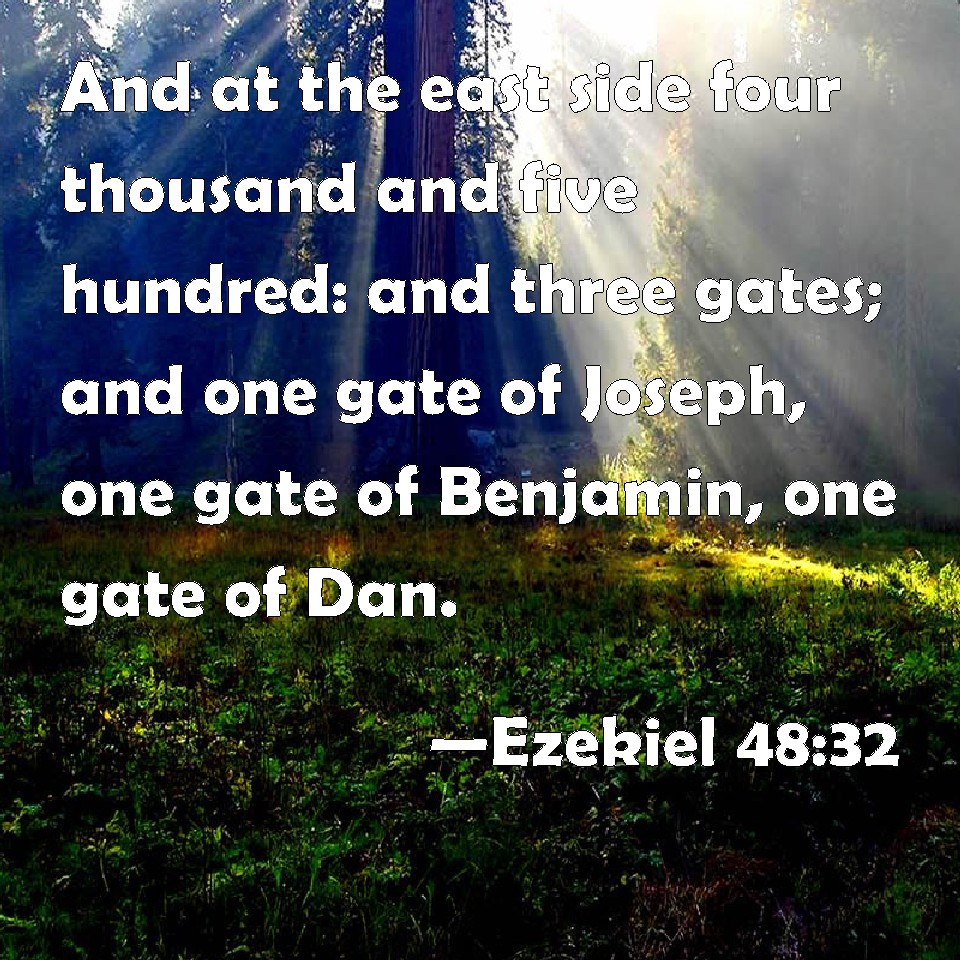 Choose a Background Ezekiel 48:32 And at the east side four thousand and five hundred: and three gates; and one gate of Joseph, one gate of Benjamin, one gate of Dan. KJV: And at the east side four thousand and five hundred: and three gates; and one gate of Joseph, one gate of Benjamin, one gate of Dan. DRB: And at the east side, four thousand and five hundred: and three gates, the gate of Joseph one, the gate of Benjamin one, the gate of Dan one. DBT: And at the east side four thousand and five hundred, and three gates: the gate of Joseph, one; the gate of Benjamin, one; the gate of Dan, one. ERV: And at the east side four thousand and five hundred reeds; and three gates: even the gate of Joseph, one; the gate of Benjamin, one; the gate of Dan, one: WBT: And at the east side four thousand and five hundred: and three gates; one gate of Joseph, one gate of Benjamin, one gate of Dan. WEB: At the east side four thousand and five hundred [reeds], and three gates: even the gate of Joseph, one; the gate of Benjamin, one; the gate of Dan, one. YLT: And on the east side five hundred, and four thousand, and three gates: the gate of Joseph one, the gate of Benjamin one, the gate of Dan one.Links Ezekiel 48:32 NIV • Ezekiel 48:32 NLT • Ezekiel 48:32 ESV • Ezekiel 48:32 NASB • Ezekiel 48:32 KJV • Ezekiel 48:32 Interlinear • Ezekiel 48:32 Commentaries • Ezekiel 48:32 Parallel Texts • Ezekiel 48:32 Bible Apps • Ezekiel 48:32 Parallel • Bible Hub |