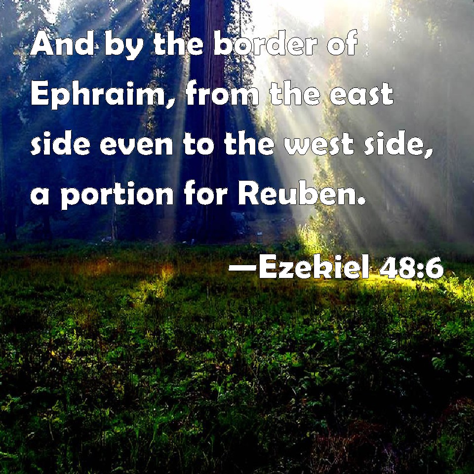 Choose a Background Ezekiel 48:6 And by the border of Ephraim, from the east side even to the west side, a portion for Reuben. KJV: And by the border of Ephraim, from the east side even unto the west side, a portion for Reuben. DRB: And by the border of Ephraim, from the east side even to the side of the sea, one portion for Ruben. DBT: And by the border of Ephraim, from the east side even unto the west side, Reuben one. ERV: And by the border of Ephraim, from the east side even unto the west side; Reuben, one portion. WBT: And by the border of Ephraim, from the east side even to the west side, a portion for Reuben. WEB: By the border of Ephraim, from the east side even to the west side, Reuben, one [portion]. YLT: and by the border of Ephraim, from the east side even unto the west side, Reuben one,Links Ezekiel 48:6 NIV • Ezekiel 48:6 NLT • Ezekiel 48:6 ESV • Ezekiel 48:6 NASB • Ezekiel 48:6 KJV • Ezekiel 48:6 Interlinear • Ezekiel 48:6 Commentaries • Ezekiel 48:6 Parallel Texts • Ezekiel 48:6 Bible Apps • Ezekiel 48:6 Parallel • Bible Hub |