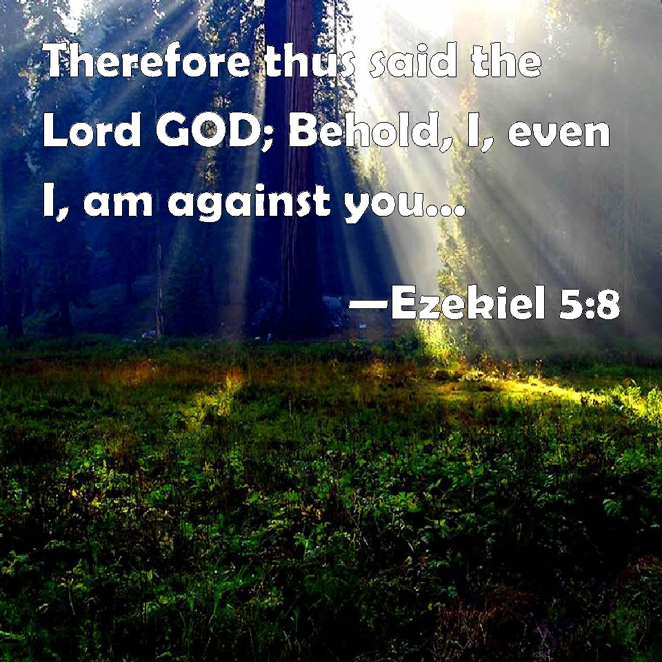 Choose a Background Ezekiel 5:8 Therefore thus said the Lord GOD; Behold, I, even I, am against you, and will execute judgments in the middle of you in the sight of the nations. KJV: Therefore thus saith the Lord GOD; Behold, I, even I, am against thee, and will execute judgments in the midst of thee in the sight of the nations. DRB: Therefore thus saith the Lord God: Behold I come against thee, and I myself will execute judgments in the midst of thee in the sight of the Gentiles. DBT: therefore thus saith the Lord Jehovah: Behold, I, even I, am against thee, and will execute judgments in the midst of thee in the sight of the nations; ERV: therefore thus saith the Lord GOD: Behold, I, even I, am against thee; and I will execute judgments in the midst of thee in the sight of the nations. WBT: Therefore thus saith the Lord GOD; Behold, I, even I, am against thee, and will execute judgments in the midst of thee in the sight of the nations. WEB: therefore thus says the Lord Yahweh: Behold, I, even I, am against you; and I will execute judgments in the midst of you in the sight of the nations. YLT: Therefore, thus said the Lord Jehovah: Lo, I am against thee, even I, And I have done in thy midst judgments, Before the eyes of the nations.Links Ezekiel 5:8 NIV • Ezekiel 5:8 NLT • Ezekiel 5:8 ESV • Ezekiel 5:8 NASB • Ezekiel 5:8 KJV • Ezekiel 5:8 Interlinear • Ezekiel 5:8 Commentaries • Ezekiel 5:8 Parallel Texts • Ezekiel 5:8 Bible Apps • Ezekiel 5:8 Parallel • Bible Hub |