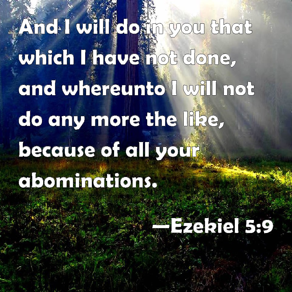 Choose a Background Ezekiel 5:9 And I will do in you that which I have not done, and whereunto I will not do any more the like, because of all your abominations. KJV: And I will do in thee that which I have not done, and whereunto I will not do any more the like, because of all thine abominations. DRB: And I will do in thee that which I have not done: and the like to which I will do no more, because of all thy abominations. DBT: and I will do in thee that which I have not done, and whereunto I will not do any more the like, because of all thine abominations. ERV: And I will do in thee that which I have not done, and whereunto I will not do any more the like, because of all thine abominations. WBT: And I will do in thee that which I have not done, and the like to which I will not do any more, because of all thy abominations. WEB: I will do in you that which I have not done, and whereunto I will not do any more the like, because of all your abominations. YLT: And I have done in thee that which I have not done, And that which I do not its like again, Because of all thine abominations.Links Ezekiel 5:9 NIV • Ezekiel 5:9 NLT • Ezekiel 5:9 ESV • Ezekiel 5:9 NASB • Ezekiel 5:9 KJV • Ezekiel 5:9 Interlinear • Ezekiel 5:9 Commentaries • Ezekiel 5:9 Parallel Texts • Ezekiel 5:9 Bible Apps • Ezekiel 5:9 Parallel • Bible Hub |
