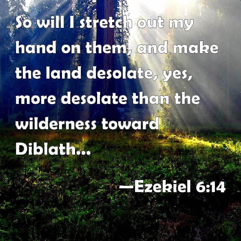 Choose a Background Ezekiel 6:14 So will I stretch out my hand on them, and make the land desolate, yes, more desolate than the wilderness toward Diblath, in all their habitations: and they shall know that I am the LORD. KJV: So will I stretch out my hand upon them, and make the land desolate, yea, more desolate than the wilderness toward Diblath, in all their habitations: and they shall know that I am the LORD. DRB: And I will stretch forth my hand upon them: and I will make the land desolate, and abandoned from the desert of Deblatha in all their dwelling places: and they shall know that I am the Lord. DBT: And I will stretch out my hand upon them, and make the land desolate, yea, more desolate than the wilderness of Diblath, in all their dwellings; and they shall know that I am Jehovah. ERV: And I will stretch out my hand upon them, and make the land desolate and waste, from the wilderness toward Diblah, throughout all their habitations: and they shall know that I am the LORD. WBT: So will I stretch out my hand upon them, and make the land desolate, even, more desolate than the wilderness towards Diblath, in all their habitations: and they shall know that I am the LORD. WEB: I will stretch out my hand on them, and make the land desolate and waste, from the wilderness toward Diblah, throughout all their habitations: and they shall know that I am Yahweh. YLT: And I have stretched out my hand against them, And have made the land a desolation, Even a desolation from the wilderness to Diblath, In all their dwellings, And they have known that I am Jehovah!'Links Ezekiel 6:14 NIV • Ezekiel 6:14 NLT • Ezekiel 6:14 ESV • Ezekiel 6:14 NASB • Ezekiel 6:14 KJV • Ezekiel 6:14 Interlinear • Ezekiel 6:14 Commentaries • Ezekiel 6:14 Parallel Texts • Ezekiel 6:14 Bible Apps • Ezekiel 6:14 Parallel • Bible Hub |