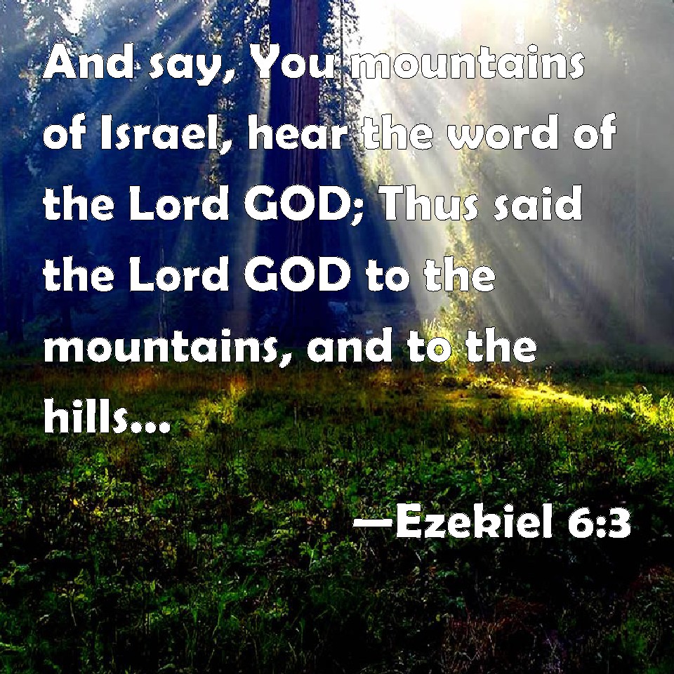 Choose a Background Ezekiel 6:3 And say, You mountains of Israel, hear the word of the Lord GOD; Thus said the Lord GOD to the mountains, and to the hills, to the rivers, and to the valleys; Behold, I, even I, will bring a sword on you, and I will destroy your high places. KJV: And say, Ye mountains of Israel, hear the word of the Lord GOD; Thus saith the Lord GOD to the mountains, and to the hills, to the rivers, and to the valleys; Behold, I, even I, will bring a sword upon you, and I will destroy your high places. DRB: And say: Ye mountains of Israel, hear the word of the Lord God: Thus Faith the Lord God to the mountains, and to the hills, and to the rocks, and the valleys: Behold, I will bring upon you the sword, and I will destroy your high places. DBT: and say, Mountains of Israel, hear the word of the Lord Jehovah: thus saith the Lord Jehovah to the mountains and to the hills, to the water-courses and to the valleys: Behold, I, even I, do bring a sword upon you, and will destroy your high places. ERV: and say, Ye mountains of Israel, hear the word of the Lord GOD: Thus saith the Lord GOD to the mountains and to the hills, to the watercourses and to the valleys: Behold, I, even I, will bring a sword upon you, and I will destroy your high places. WBT: And say, Ye mountains of Israel, hear the word of the Lord GOD: Thus saith the Lord GOD to the mountains, and to the hills, to the rivers, and to the valleys; Behold, I, even I, will bring a sword upon you, and I will destroy your high places. WEB: and say, You mountains of Israel, hear the word of the Lord Yahweh: Thus says the Lord Yahweh to the mountains and to the hills, to the watercourses and to the valleys: Behold, I, even I, will bring a sword on you, and I will destroy your high places. YLT: And thou hast said: Mountains of Israel, Hear ye a word of the Lord Jehovah: Thus said the Lord Jehovah To the mountains, and to the hills, To the streams, and to the valleys, Lo, I, I am bringing in against you a sword, And I have destroyed your high places.Links Ezekiel 6:3 NIV • Ezekiel 6:3 NLT • Ezekiel 6:3 ESV • Ezekiel 6:3 NASB • Ezekiel 6:3 KJV • Ezekiel 6:3 Interlinear • Ezekiel 6:3 Commentaries • Ezekiel 6:3 Parallel Texts • Ezekiel 6:3 Bible Apps • Ezekiel 6:3 Parallel • Bible Hub |