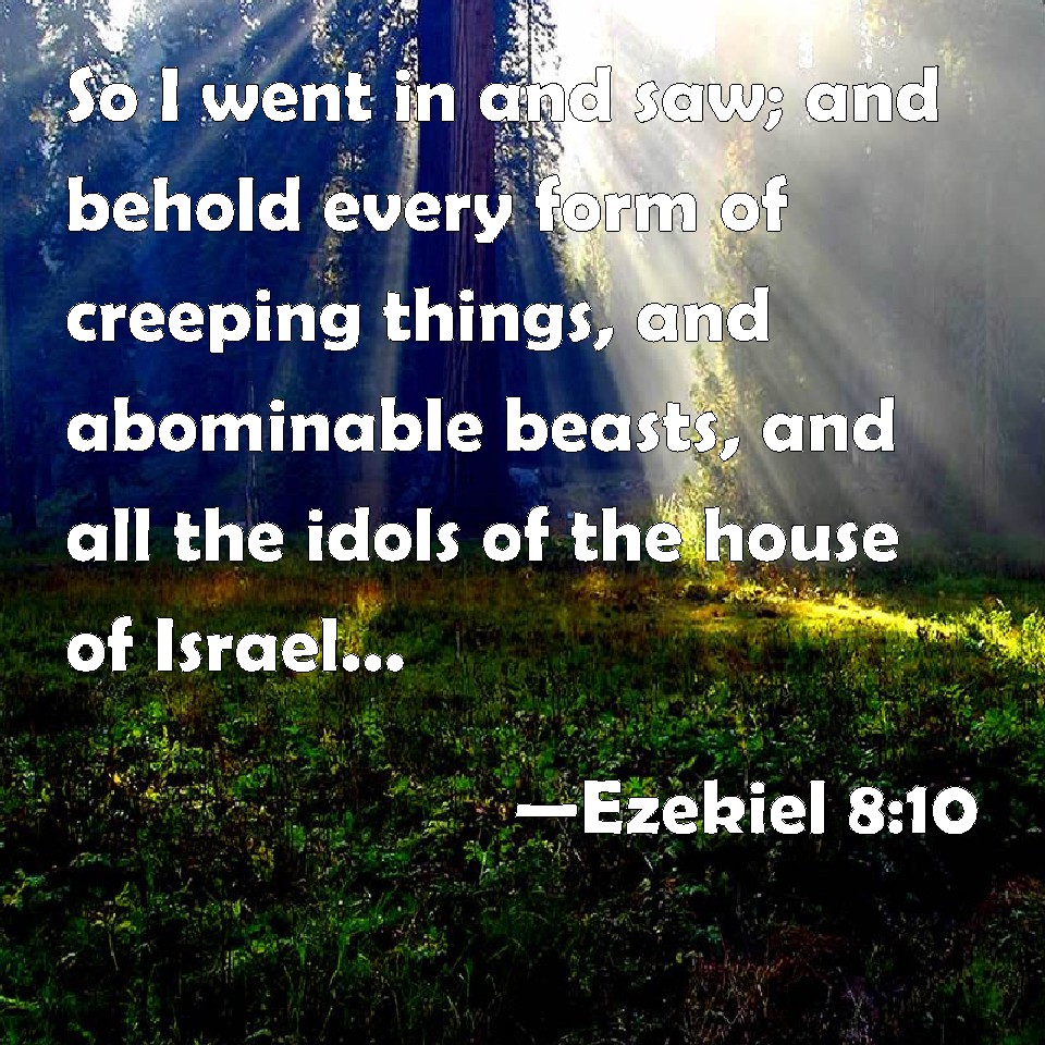 Choose a Background Ezekiel 8:10 So I went in and saw; and behold every form of creeping things, and abominable beasts, and all the idols of the house of Israel, portrayed on the wall round about. KJV: So I went in and saw; and behold every form of creeping things, and abominable beasts, and all the idols of the house of Israel, pourtrayed upon the wall round about. DRB: And I went in and saw, and behold every form of creeping things, and of living creatures, the abomination, and all the idols of the house of Israel, were painted on the wall all round about. DBT: And I went in and looked, and behold, every form of creeping thing and abominable beast, and all the idols of the house of Israel, portrayed upon the wall round about. ERV: So I went in and saw; and behold every form of creeping things, and abominable beasts, and all the idols of the house of Israel, pourtrayed upon the wall round about. WBT: So I went in and saw; and behold every form of creeping animals, and abominable beasts, and all the idols of the house of Israel, portrayed around upon the wall. WEB: So I went in and saw; and see, every form of creeping things, and abominable animals, and all the idols of the house of Israel, portrayed around on the wall. YLT: And I go in, and look, and lo, every form of creeping thing, and detestable beast — and all the Idols of the house of Israel — graved on the wall, all round about,Links Ezekiel 8:10 NIV • Ezekiel 8:10 NLT • Ezekiel 8:10 ESV • Ezekiel 8:10 NASB • Ezekiel 8:10 KJV • Ezekiel 8:10 Interlinear • Ezekiel 8:10 Commentaries • Ezekiel 8:10 Parallel Texts • Ezekiel 8:10 Bible Apps • Ezekiel 8:10 Parallel • Bible Hub |