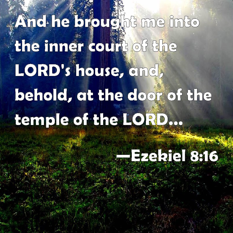 Choose a Background Ezekiel 8:16 And he brought me into the inner court of the LORD's house, and, behold, at the door of the temple of the LORD, between the porch and the altar, were about five and twenty men, with their backs toward the temple of the LORD, and their faces toward the east; and they worshipped the sun toward the east. KJV: And he brought me into the inner court of the LORD'S house, and, behold, at the door of the temple of the LORD, between the porch and the altar, were about five and twenty men, with their backs toward the temple of the LORD, and their faces toward the east; and they worshipped the sun toward the east. DRB: And he brought me into the inner court of the house of the Lord: and behold at the door of the temple of the Lord, between the porch and the altar, were about five and twenty men having their backs towards the temple of the Lord, and their faces to the east: and they adored towards the rising of the sun. DBT: And he brought me into the inner court of Jehovah's house, and behold, at the entry of the temple of Jehovah, between the porch and the altar, were about five and twenty men, with their backs toward the temple of Jehovah and their faces toward the east; and they worshipped the sun toward the east. ERV: And he brought me into the inner court of the LORD'S house, and behold, at the door of the temple of the LORD, between the porch and the altar, were about five and twenty men, with their backs toward the temple of the LORD, and their faces toward the east; and they worshipped the sun toward the east. WBT: And he brought me into the inner court of the LORD'S house, and behold, at the door of the temple of the LORD, between the porch and the altar, were about five and twenty men, with their backs towards the temple of the LORD, and their faces towards the east; and they worshiped the sun towards the east. WEB: He brought me into the inner court of Yahweh's house; and see, at the door of the temple of Yahweh, between the porch and the altar, were about twenty-five men, with their backs toward the temple of Yahweh, and their faces toward the east; and they were worshipping the sun toward the east. YLT: And He bringeth me in unto the inner court of the house of Jehovah, and lo, at the opening of the temple of Jehovah, between the porch and the altar, about twenty-five men, their backs toward the temple of Jehovah, and their faces eastward, and they are bowing themselves eastward to the sun.Links Ezekiel 8:16 NIV • Ezekiel 8:16 NLT • Ezekiel 8:16 ESV • Ezekiel 8:16 NASB • Ezekiel 8:16 KJV • Ezekiel 8:16 Interlinear • Ezekiel 8:16 Commentaries • Ezekiel 8:16 Parallel Texts • Ezekiel 8:16 Bible Apps • Ezekiel 8:16 Parallel • Bible Hub |