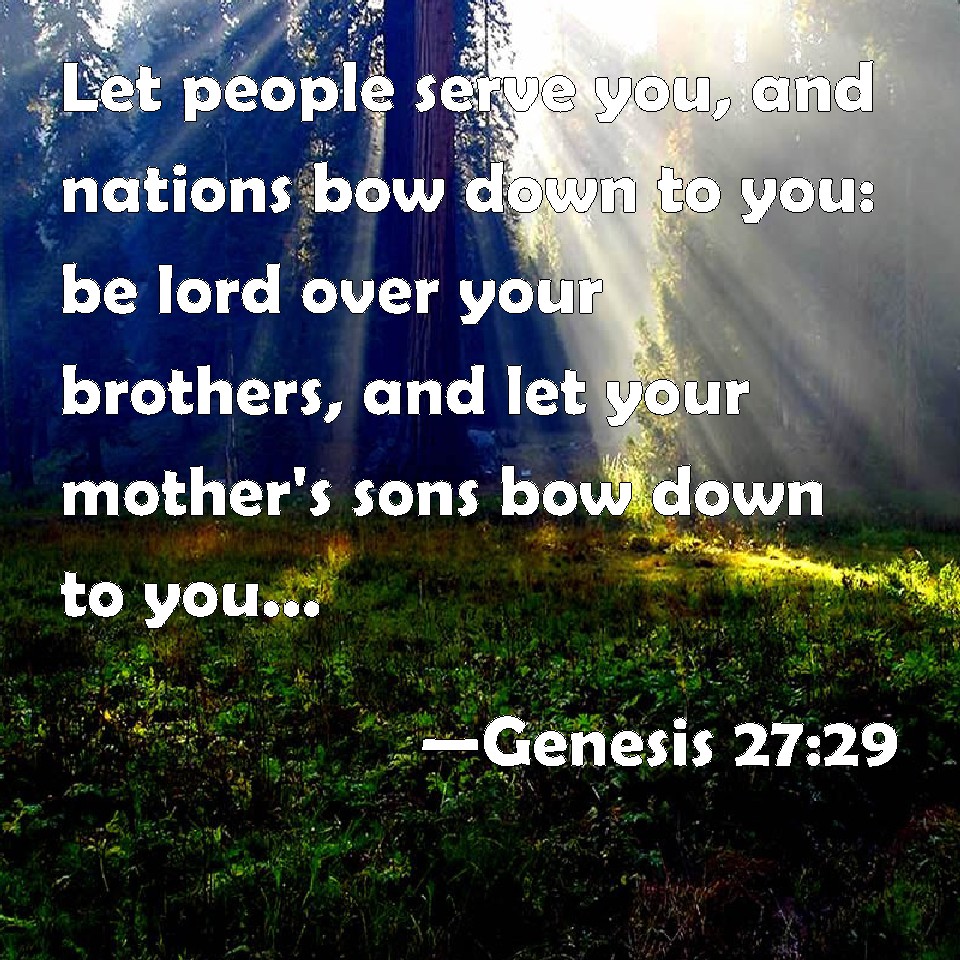 Choose a Background Genesis 27:29 Let people serve you, and nations bow down to you: be lord over your brothers, and let your mother's sons bow down to you: cursed be every one that curses you, and blessed be he that blesses you. KJV: Let people serve thee, and nations bow down to thee: be lord over thy brethren, and let thy mother's sons bow down to thee: cursed be every one that curseth thee, and blessed be he that blesseth thee. DRB: And let peoples serve thee, and tribes worship thee: be thou lord of thy brethren, and let they mother's children bow down before thee. Cursed be he that curseth thee: and let him that blesseth thee be filled with blessings. DBT: Let peoples serve thee, And races bow down to thee. Be lord over thy brethren, And let thy mother's sons bow down to thee. Cursed be they that curse thee, And blessed be they that bless thee. ERV: Let peoples serve thee, And nations bow down to thee: Be lord over thy brethren, And let thy mother's sons bow down to thee: Cursed be every one that curseth thee, And blessed be every one that blesseth thee. WBT: Let people serve thee, and nations bow down to thee; be lord over thy brethren, and let thy mother's sons bow down to thee: cursed be every one that curseth thee, and blessed be he that blesseth thee. WEB: Let peoples serve you, and nations bow down to you. Be lord over your brothers. Let your mother's sons bow down to you. Cursed be everyone who curses you. Blessed be everyone who blesses you." YLT: peoples serve thee, and nations bow themselves to thee, be thou mighty over thy brethren, and the sons of thy mother bow themselves to thee; those who curse thee are cursed, and those who bless thee are blessed.'Links Genesis 27:29 NIV • Genesis 27:29 NLT • Genesis 27:29 ESV • Genesis 27:29 NASB • Genesis 27:29 KJV • Genesis 27:29 Interlinear • Genesis 27:29 Commentaries • Genesis 27:29 Parallel Texts • Genesis 27:29 Bible Apps • Genesis 27:29 Parallel • Bible Hub |