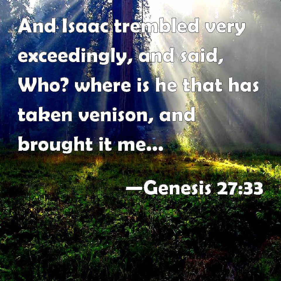 Choose a Background Genesis 27:33 And Isaac trembled very exceedingly, and said, Who? where is he that has taken venison, and brought it me, and I have eaten of all before you came, and have blessed him? yes, and he shall be blessed. KJV: And Isaac trembled very exceedingly, and said, Who? where is he that hath taken venison, and brought it me, and I have eaten of all before thou camest, and have blessed him? yea, and he shall be blessed. DRB: Isaac was struck with fear, and astonished exceedingly: and wondering beyond what can be believed, said Who is he then the even now brought me venison that he had taken, and I ate of all before thou camest? and I have blessed him, and he shall be blessed. DBT: Then Isaac trembled with exceeding great trembling, and said, Who was he, then, that hunted venison and brought it to me? And I have eaten of all before thou camest, and have blessed him; also blessed he shall be. ERV: And Isaac trembled very exceedingly, and said, Who then is he that hath taken venison, and brought it me, and I have eaten of all before thou camest, and have blessed him? yea, and he shall be blessed. WBT: And Isaac trembled exceedingly, and said, Who? where is he that hath taken venison, and brought it me, and I have eaten of all before thou camest, and have blessed him? yea, and he shall be blessed. WEB: Isaac trembled violently, and said, "Who, then, is he who has taken venison, and brought it me, and I have eaten of all before you came, and have blessed him? Yes, he will be blessed." YLT: and Isaac trembleth a very great trembling, and saith, 'Who, now, is he who hath provided provision, and bringeth in to me, and I eat of all before thou comest in, and I bless him? — yea, blessed is he.'Links Genesis 27:33 NIV • Genesis 27:33 NLT • Genesis 27:33 ESV • Genesis 27:33 NASB • Genesis 27:33 KJV • Genesis 27:33 Interlinear • Genesis 27:33 Commentaries • Genesis 27:33 Parallel Texts • Genesis 27:33 Bible Apps • Genesis 27:33 Parallel • Bible Hub |