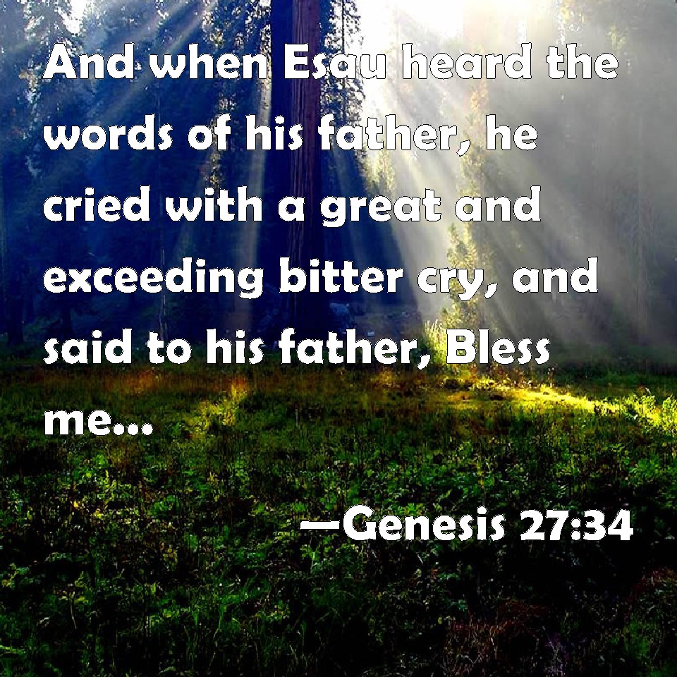 Choose a Background Genesis 27:34 And when Esau heard the words of his father, he cried with a great and exceeding bitter cry, and said to his father, Bless me, even me also, O my father. KJV: And when Esau heard the words of his father, he cried with a great and exceeding bitter cry, and said unto his father, Bless me, even me also, O my father. DRB: Esau having heard his father's words, roared out with a great cry: and being in a great consternation, said: Bless me also, my father. DBT: When Esau heard the words of his father, he cried with a great and exceeding bitter cry, and said to his father, Bless me me also, my father! ERV: When Esau heard the words of his father, he cried with an exceeding great and bitter cry, and said unto his father, Bless me, even me also, O my father. WBT: And when Esau heard the words of his father, he cried with a great and exceedingly bitter cry, and said to his father, Bless me, even me also, O my father. WEB: When Esau heard the words of his father, he cried with an exceeding great and bitter cry, and said to his father, "Bless me, even me also, my father." YLT: When Esau heareth the words of his father, then he crieth a very great and bitter cry, and saith to his father, 'Bless me, me also, O my father;'Links Genesis 27:34 NIV • Genesis 27:34 NLT • Genesis 27:34 ESV • Genesis 27:34 NASB • Genesis 27:34 KJV • Genesis 27:34 Interlinear • Genesis 27:34 Commentaries • Genesis 27:34 Parallel Texts • Genesis 27:34 Bible Apps • Genesis 27:34 Parallel • Bible Hub |