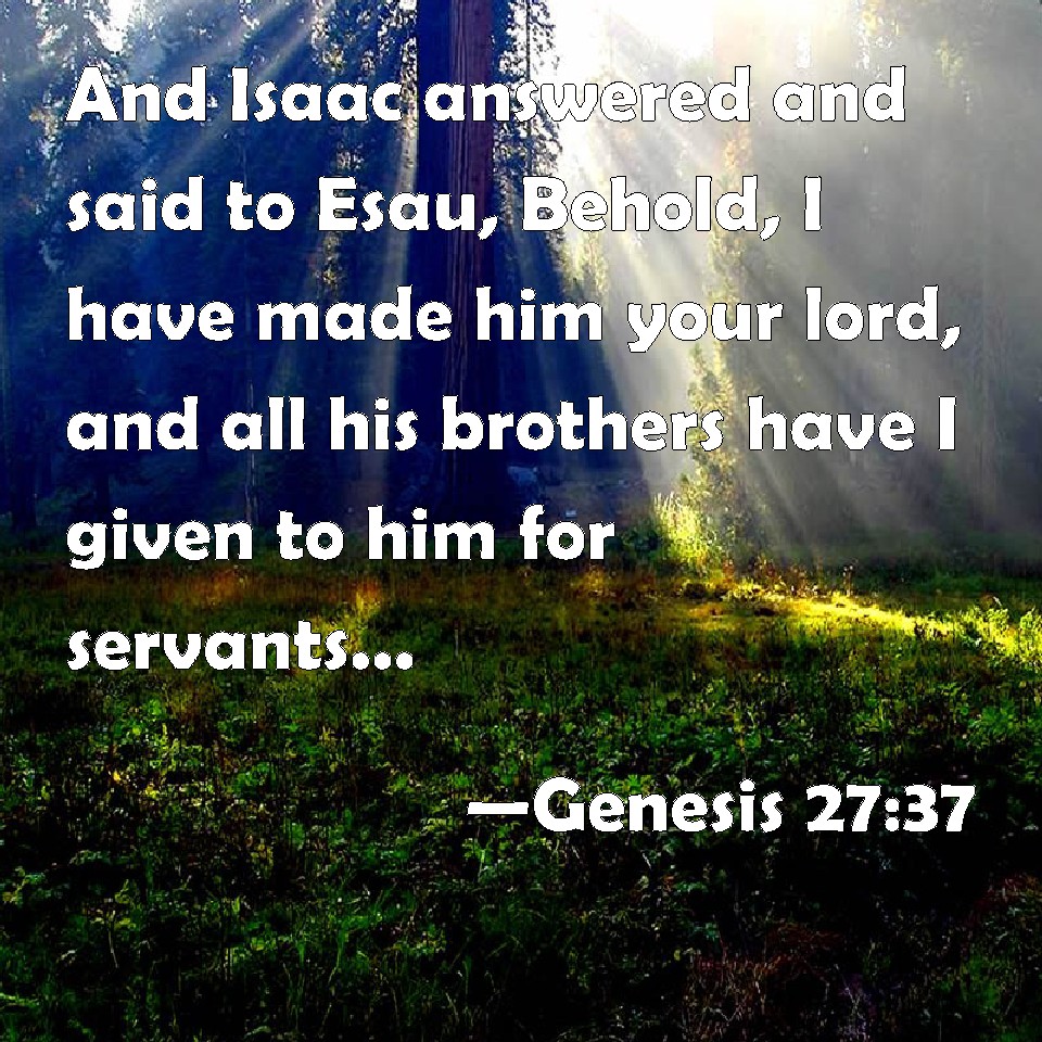 Choose a Background Genesis 27:37 And Isaac answered and said to Esau, Behold, I have made him your lord, and all his brothers have I given to him for servants; and with corn and wine have I sustained him: and what shall I do now to you, my son? KJV: And Isaac answered and said unto Esau, Behold, I have made him thy lord, and all his brethren have I given to him for servants; and with corn and wine have I sustained him: and what shall I do now unto thee, my son? DRB: Isaac answered: I have appointed him thy lord, and have made all his brethren his servants: I have established him with corn and wine, and after this, what shall I do more for thee, my son? DBT: And Isaac answered and said to Esau, Behold, I have made him lord over thee, and all his brethren have I given to him for servants, and with corn and new wine have I supplied him and what can I do now for thee, my son? ERV: And Isaac answered and said unto Esau, Behold, I have made him thy lord, and all his brethren have I given to him for servants; and with corn and wine have I sustained him: and what then shall I do for thee, my son? WBT: And Isaac answered and said to Esau, Behold, I have made him thy lord, and all his brethren have I given to him for servants; and with corn and wine have I sustained him: and what shall I do now to thee, my son? WEB: Isaac answered Esau, "Behold, I have made him your lord, and all his brothers have I given to him for servants. With grain and new wine have I sustained him. What then will I do for you, my son?" YLT: And Isaac answereth and saith to Esau, 'Lo, a mighty one have I set him over thee, and all his brethren have I given to him for servants, and with corn and wine have I sustained him; and for thee now, what shall I do, my son?'Links Genesis 27:37 NIV • Genesis 27:37 NLT • Genesis 27:37 ESV • Genesis 27:37 NASB • Genesis 27:37 KJV • Genesis 27:37 Interlinear • Genesis 27:37 Commentaries • Genesis 27:37 Parallel Texts • Genesis 27:37 Bible Apps • Genesis 27:37 Parallel • Bible Hub |