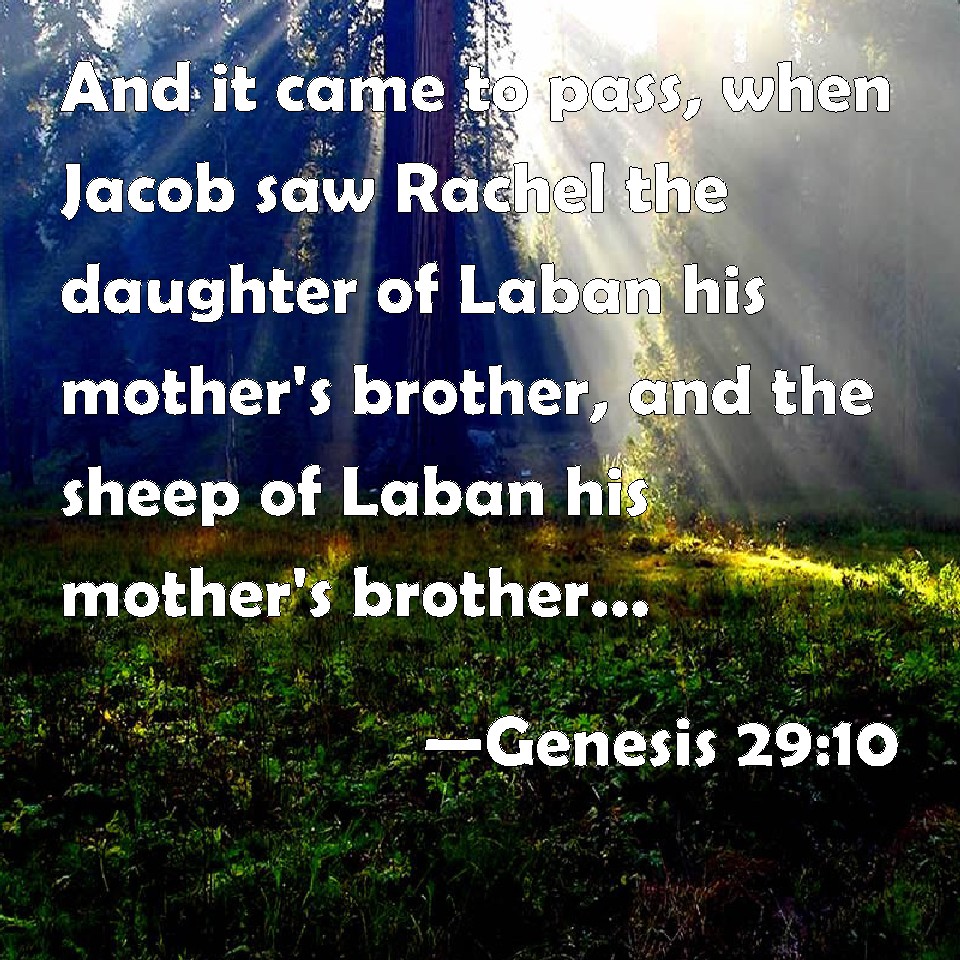 Choose a Background Genesis 29:10 And it came to pass, when Jacob saw Rachel the daughter of Laban his mother's brother, and the sheep of Laban his mother's brother, that Jacob went near, and rolled the stone from the well's mouth, and watered the flock of Laban his mother's brother. KJV: And it came to pass, when Jacob saw Rachel the daughter of Laban his mother's brother, and the sheep of Laban his mother's brother, that Jacob went near, and rolled the stone from the well's mouth, and watered the flock of Laban his mother's brother. DRB: And when Jacob saw her, and knew her to be his cousin-german, and that they were the sheep of Laban, his uncle: he removed the stone wherewith the well was closed. DBT: And it came to pass when Jacob saw Rachel the daughter of Laban his mother's brother, and the sheep of Laban his mother's brother, that Jacob went near, and rolled the stone from the mouth of the well, and watered the sheep of Laban his mother's brother. ERV: And it came to pass, when Jacob saw Rachel the daughter of Laban his mother's brother, and the sheep of Laban his mother's brother, that Jacob went near, and rolled the stone from the well's mouth, and watered the flock of Laban his mother's brother. WBT: And it came to pass, when Jacob saw Rachel, the daughter of Laban his mother's brother, and the sheep of Laban his mother's brother; that Jacob went near, and rolled the stone from the well's mouth, and watered the flock of Laban his mother's brother. WEB: It happened, when Jacob saw Rachel the daughter of Laban, his mother's brother, and the sheep of Laban, his mother's brother, that Jacob went near, and rolled the stone from the well's mouth, and watered the flock of Laban his mother's brother. YLT: and it cometh to pass when Jacob hath seen Rachel, daughter of Laban his mother's brother, and the flock of Laban his mother's brother, that Jacob cometh nigh and rolleth the stone from off the mouth of the well, and watereth the flock of Laban his mother's brother.Links Genesis 29:10 NIV • Genesis 29:10 NLT • Genesis 29:10 ESV • Genesis 29:10 NASB • Genesis 29:10 KJV • Genesis 29:10 Interlinear • Genesis 29:10 Commentaries • Genesis 29:10 Parallel Texts • Genesis 29:10 Bible Apps • Genesis 29:10 Parallel • Bible Hub |