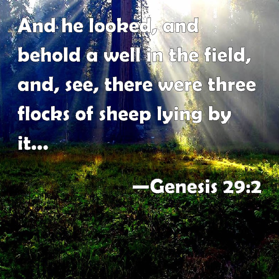 Choose a Background Genesis 29:2 And he looked, and behold a well in the field, and, see, there were three flocks of sheep lying by it; for out of that well they watered the flocks: and a great stone was on the well's mouth. KJV: And he looked, and behold a well in the field, and, lo, there were three flocks of sheep lying by it; for out of that well they watered the flocks: and a great stone was upon the well's mouth. DRB: And he saw a well in the field, and three flocks of sheep lying by it: for the beasts were watered out of it, and the mouth thereof was closed with a great stone. DBT: And he looked, and behold, there was a well in the fields, and behold there, three flocks of sheep were lying by it; for out of that well they watered the flocks, and a great stone was at the mouth of the well. ERV: And he looked, and behold a well in the field, and, lo, three flocks of sheep lying there by it; for out of that well they watered the flocks: and the stone upon the well's mouth was great. WBT: And he looked, and behold, a well in the field, and lo, there were three flocks of sheep lying by it; for out of that well they watered the flocks: and a great stone was upon the well's mouth. WEB: He looked, and behold, a well in the field, and, behold, three flocks of sheep lying there by it. For out of that well they watered the flocks. The stone on the well's mouth was large. YLT: and he looketh, and lo, a well in the field, and lo, there three droves of a flock crouching by it, for from that well they water the droves, and the great stone is on the mouth of the well.Links Genesis 29:2 NIV • Genesis 29:2 NLT • Genesis 29:2 ESV • Genesis 29:2 NASB • Genesis 29:2 KJV • Genesis 29:2 Interlinear • Genesis 29:2 Commentaries • Genesis 29:2 Parallel Texts • Genesis 29:2 Bible Apps • Genesis 29:2 Parallel • Bible Hub |