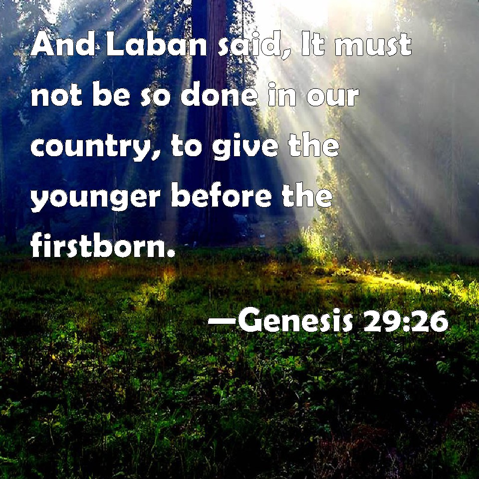 Choose a Background Genesis 29:26 And Laban said, It must not be so done in our country, to give the younger before the firstborn. KJV: And Laban said, It must not be so done in our country, to give the younger before the firstborn. DRB: Laban answered: It is not the custom in this place, to give the younger in marriage first. DBT: And Laban said, It is not so done in our place, to give the younger before the firstborn. ERV: And Laban said, It is not so done in our place, to give the younger before the firstborn. WBT: And Laban said, it must not be so done in our country, to give the younger before the first-born. WEB: Laban said, "It is not done so in our place, to give the younger before the firstborn. YLT: And Laban saith, 'It is not done so in our place, to give the younger before the first-born;Links Genesis 29:26 NIV • Genesis 29:26 NLT • Genesis 29:26 ESV • Genesis 29:26 NASB • Genesis 29:26 KJV • Genesis 29:26 Interlinear • Genesis 29:26 Commentaries • Genesis 29:26 Parallel Texts • Genesis 29:26 Bible Apps • Genesis 29:26 Parallel • Bible Hub |
