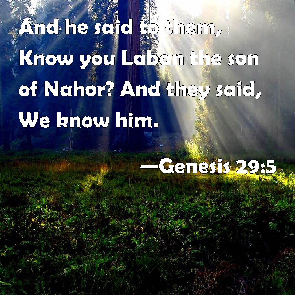 Choose a Background Genesis 29:5 And he said to them, Know you Laban the son of Nahor? And they said, We know him. KJV: And he said unto them, Know ye Laban the son of Nahor? And they said, We know him. DRB: And he asked them, saying: Know you Laban the son of Nachor? They said: We know him. DBT: And he said to them, Do ye know Laban the son of Nahor? And they said, We do know him. ERV: And he said unto them, Know ye Laban the son of Nahor? And they said, We know him. WBT: And he said to them, Know ye Laban the son of Nahor? and they said, We know him. WEB: He said to them, "Do you know Laban, the son of Nahor?" They said, "We know him." YLT: And he saith to them, 'Have ye known Laban, son of Nahor?' and they say, 'We have known.'Links Genesis 29:5 NIV • Genesis 29:5 NLT • Genesis 29:5 ESV • Genesis 29:5 NASB • Genesis 29:5 KJV • Genesis 29:5 Interlinear • Genesis 29:5 Commentaries • Genesis 29:5 Parallel Texts • Genesis 29:5 Bible Apps • Genesis 29:5 Parallel • Bible Hub |