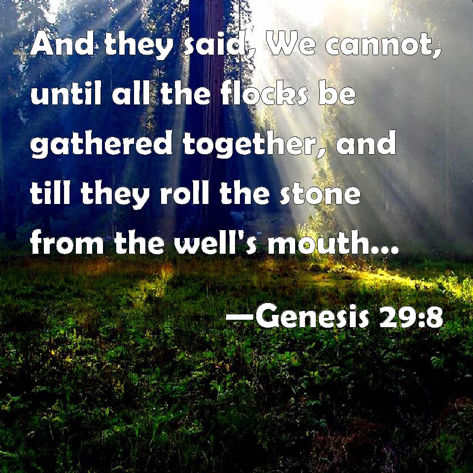 Choose a Background Genesis 29:8 And they said, We cannot, until all the flocks be gathered together, and till they roll the stone from the well's mouth; then we water the sheep. KJV: And they said, We cannot, until all the flocks be gathered together, and till they roll the stone from the well's mouth; then we water the sheep. DRB: They answered: We cannot, till all the cattle be gathered together, and we remove the stone from the well's mouth, that we may water the flocks. DBT: And they said, We cannot until all the flocks are gathered together, and they roll the stone from the mouth of the well, and we water the sheep. ERV: And they said, We cannot, until all the flocks be gathered together, and they roll the stone from the well's mouth; then we water the sheep. WBT: And they said, We cannot, until all the flocks are collected, and till they roll the stone from the well's mouth; then we water the sheep. WEB: They said, "We can't, until all the flocks are gathered together, and they roll the stone from the well's mouth. Then we water the sheep." YLT: And they say, 'We are not able, till that all the droves be gathered together, and they have rolled away the stone from the mouth of the well, and we have watered the flock.'Links Genesis 29:8 NIV • Genesis 29:8 NLT • Genesis 29:8 ESV • Genesis 29:8 NASB • Genesis 29:8 KJV • Genesis 29:8 Interlinear • Genesis 29:8 Commentaries • Genesis 29:8 Parallel Texts • Genesis 29:8 Bible Apps • Genesis 29:8 Parallel • Bible Hub |