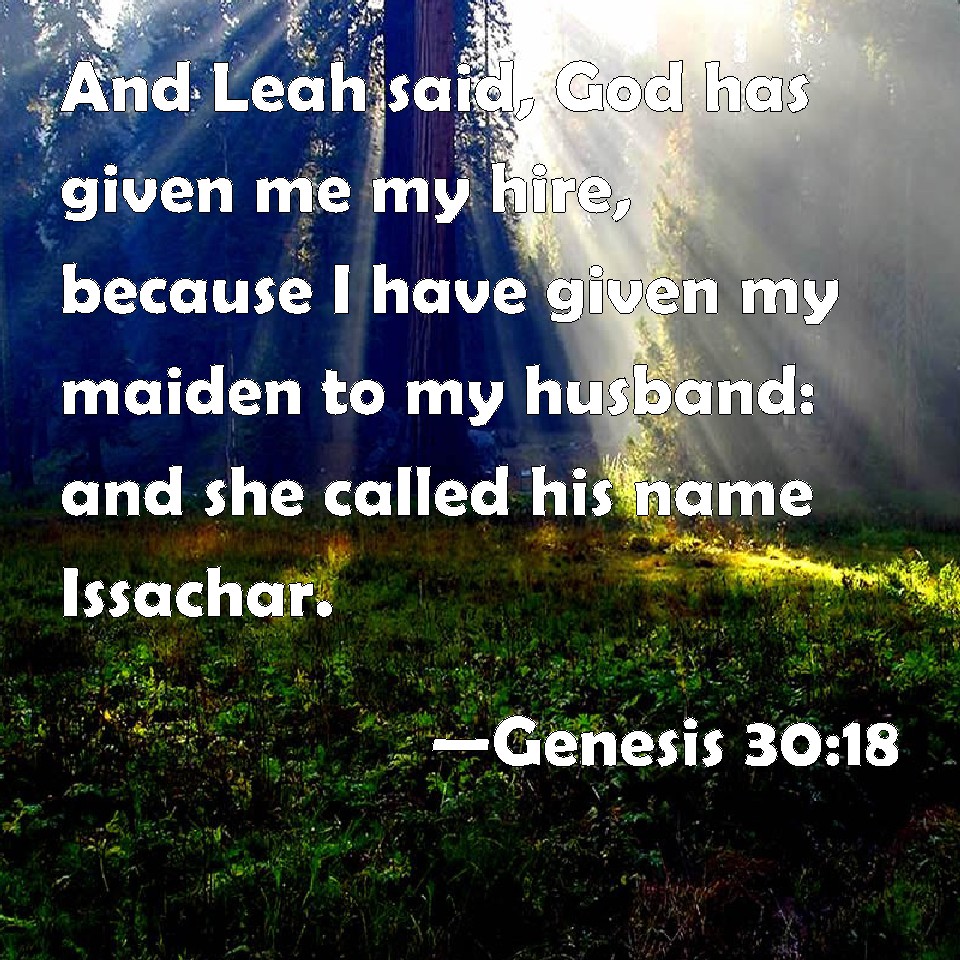Choose a Background Genesis 30:18 And Leah said, God has given me my hire, because I have given my maiden to my husband: and she called his name Issachar. KJV: And Leah said, God hath given me my hire, because I have given my maiden to my husband: and she called his name Issachar. DRB: And said: God hath given me a reward, because I gave my handmaid to my husband. And she called his name Issachar. DBT: And Leah said, God has given me my hire, because I have given my maidservant to my husband; and she called his name Issachar. ERV: And Leah said, God hath given me my hire, because I gave my handmaid to my husband: and she called his name Issachar. WBT: And Leah said, God hath given me my hire, because I have given my maiden to my husband: and she called his name Issachar. WEB: Leah said, "God has given me my hire, because I gave my handmaid to my husband." She named him Issachar. YLT: and Leah saith, 'God hath given my hire, because I have given my maid-servant to my husband;' and she calleth his name Issachar.Links Genesis 30:18 NIV • Genesis 30:18 NLT • Genesis 30:18 ESV • Genesis 30:18 NASB • Genesis 30:18 KJV • Genesis 30:18 Interlinear • Genesis 30:18 Commentaries • Genesis 30:18 Parallel Texts • Genesis 30:18 Bible Apps • Genesis 30:18 Parallel • Bible Hub |