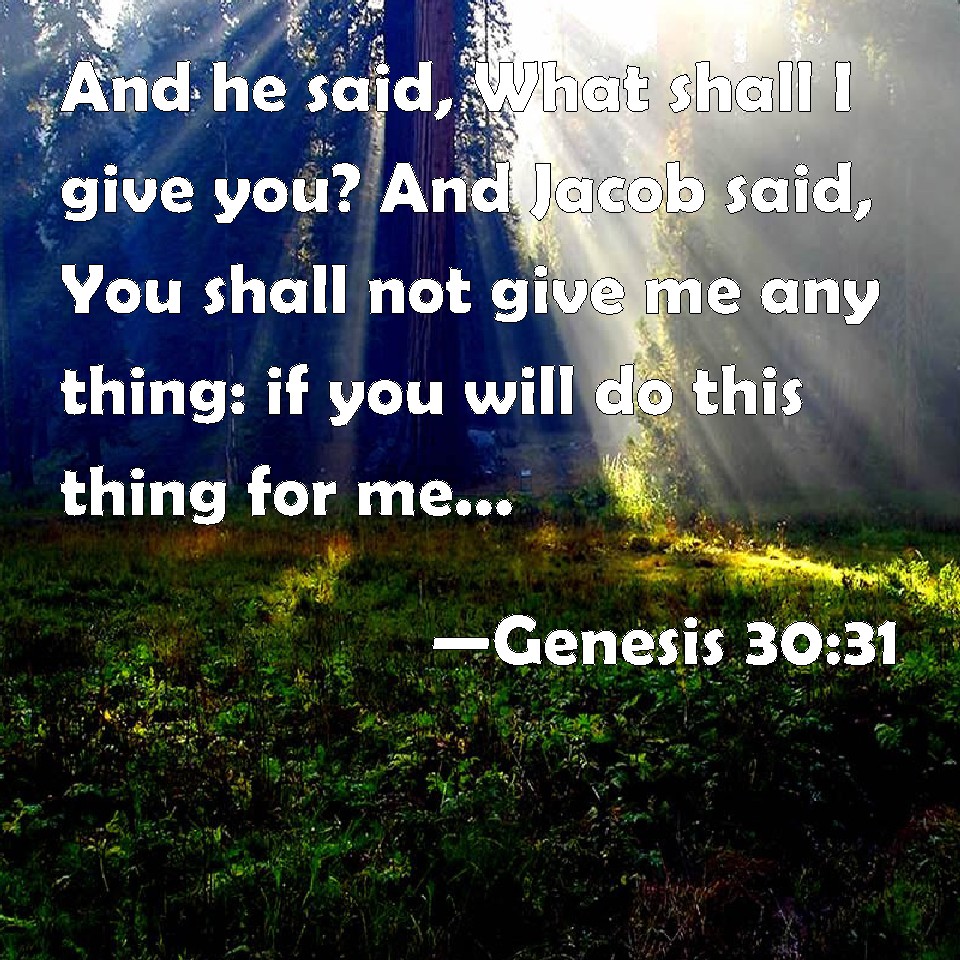 Choose a Background Genesis 30:31 And he said, What shall I give you? And Jacob said, You shall not give me any thing: if you will do this thing for me, I will again feed and keep your flock. KJV: And he said, What shall I give thee? And Jacob said, Thou shalt not give me any thing: if thou wilt do this thing for me, I will again feed and keep thy flock: DRB: And Laban said: What shall I give thee? But he said: I require nothing: but if thou wilt do what I demand, I will feed, and keep thy sheep again. DBT: And he said, What shall I give thee? And Jacob said, Thou shalt not give me anything. If thou doest this for me, I will again feed and keep thy flock: ERV: And he said, What shall I give thee? And Jacob said, Thou shalt not give me aught: if thou wilt do this thing for me, I will again feed thy flock and keep it. WBT: And he said, What shall I give thee? And Jacob said, Thou shalt not give me any thing; if thou wilt do this thing for me, I will again feed and keep thy flock: WEB: He said, "What shall I give you?" Jacob said, "You shall not give me anything. If you will do this thing for me, I will again feed your flock and keep it. YLT: And he saith, 'What do I give to thee?' And Jacob saith, 'Thou dost not give me anything; if thou do for me this thing, I turn back; I have delight; thy flock I watch;Links Genesis 30:31 NIV • Genesis 30:31 NLT • Genesis 30:31 ESV • Genesis 30:31 NASB • Genesis 30:31 KJV • Genesis 30:31 Interlinear • Genesis 30:31 Commentaries • Genesis 30:31 Parallel Texts • Genesis 30:31 Bible Apps • Genesis 30:31 Parallel • Bible Hub |