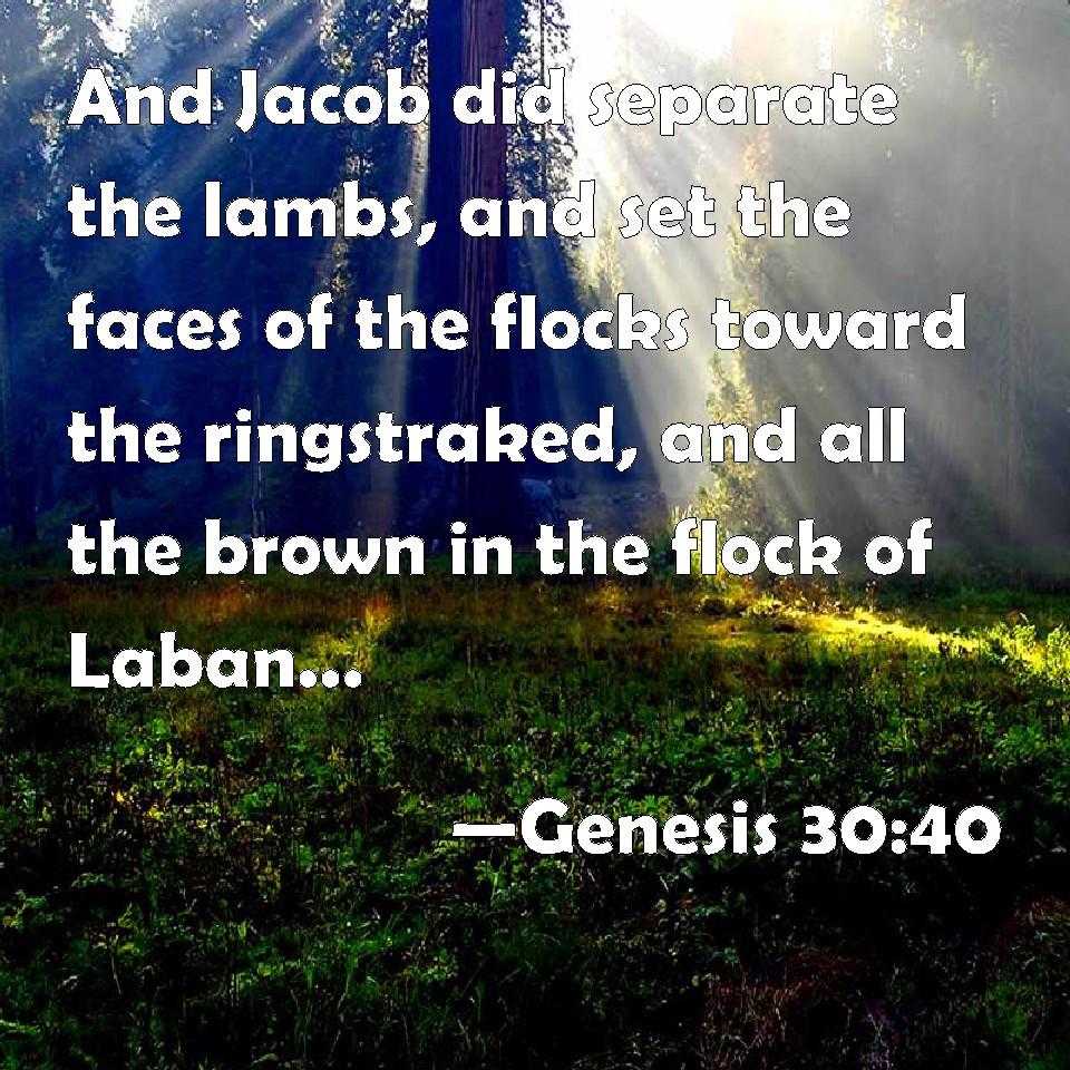 Choose a Background Genesis 30:40 And Jacob did separate the lambs, and set the faces of the flocks toward the ringstraked, and all the brown in the flock of Laban; and he put his own flocks by themselves, and put them not to Laban's cattle. KJV: And Jacob did separate the lambs, and set the faces of the flocks toward the ringstraked, and all the brown in the flock of Laban; and he put his own flocks by themselves, and put them not unto Laban's cattle. DRB: And Jacob separated the flock, and put the rods in the troughs before the eyes of the rams: and all the white and the black were Laban's: and the rest were Jacob's, when the flocks were separated one from the other. DBT: And Jacob separated the lambs, and set the faces of the flock toward the ringstraked, and all the brown in the flock of Laban; and he made himself separate flocks, and did not put them with Laban's flock. ERV: And Jacob separated the lambs, and set the faces of the flocks toward the ringstraked and all the black in the flock of Laban; and he put his own droves apart, and put them not unto Laban's flock. WBT: And Jacob separated the lambs, and set the faces of the flocks towards the ring-streaked, and all the brown in the flock of Laban: and he put his own flocks by themselves, and put them not with Laban's cattle. WEB: Jacob separated the lambs, and set the faces of the flocks toward the streaked and all the black in the flock of Laban: and he put his own droves apart, and didn't put them into Laban's flock. YLT: And the lambs hath Jacob parted, and he putteth the face of the flock towards the ring-streaked, also all the brown in the flock of Laban, and he setteth his own droves by themselves, and hath not set them near Laban's flock.Links Genesis 30:40 NIV • Genesis 30:40 NLT • Genesis 30:40 ESV • Genesis 30:40 NASB • Genesis 30:40 KJV • Genesis 30:40 Interlinear • Genesis 30:40 Commentaries • Genesis 30:40 Parallel Texts • Genesis 30:40 Bible Apps • Genesis 30:40 Parallel • Bible Hub |