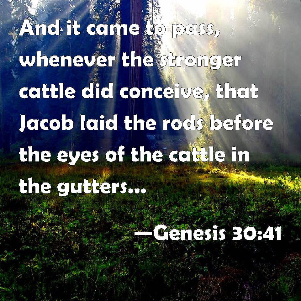 Choose a Background Genesis 30:41 And it came to pass, whenever the stronger cattle did conceive, that Jacob laid the rods before the eyes of the cattle in the gutters, that they might conceive among the rods. KJV: And it came to pass, whensoever the stronger cattle did conceive, that Jacob laid the rods before the eyes of the cattle in the gutters, that they might conceive among the rods. DRB: So when the ewes went first to ram, Jacob put the rods in the roughs of water before the eyes of the rams, and of the ewes, that they might conceive while they were looking upon them: DBT: And it came to pass whensoever the strong cattle were ardent, that Jacob laid the rods before the eyes of the flock in the gutters, that they might become ardent among the rods; ERV: And it came to pass, whensoever the stronger of the flock did conceive, that Jacob laid the rods before the eyes of the flock in the gutters, that they might conceive among the rods; WBT: And it came to pass, whenever the stronger cattle conceived, that Jacob laid the rods before the eyes of the cattle in the gutters, that they might conceive among the rods. WEB: It happened, whenever the stronger of the flock conceived, that Jacob laid the rods before the eyes of the flock in the gutters, that they might conceive among the rods; YLT: And it hath come to pass whenever the strong ones of the flock conceive, that Jacob set the rods before the eyes of the flock in the gutters, to cause them to conceive by the rods,Links Genesis 30:41 NIV • Genesis 30:41 NLT • Genesis 30:41 ESV • Genesis 30:41 NASB • Genesis 30:41 KJV • Genesis 30:41 Interlinear • Genesis 30:41 Commentaries • Genesis 30:41 Parallel Texts • Genesis 30:41 Bible Apps • Genesis 30:41 Parallel • Bible Hub |