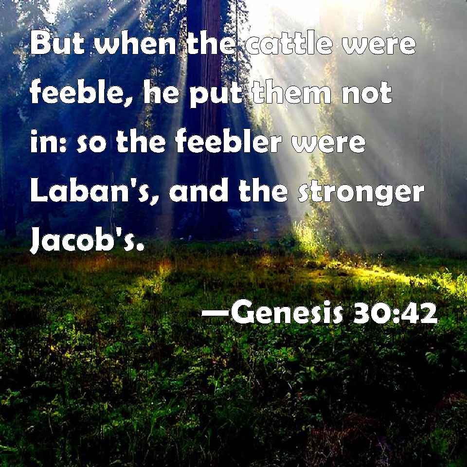 Choose a Background Genesis 30:42 But when the cattle were feeble, he put them not in: so the feebler were Laban's, and the stronger Jacob's. KJV: But when the cattle were feeble, he put them not in: so the feebler were Laban's, and the stronger Jacob's. DRB: But when the latter coming was, and the last conceiving, he did not put them. And those that were late ward, become Laban's: and they of the first time, Jacob's. DBT: but when the sheep were feeble, he put them not in; so the feeble were Laban's, and the strong Jacob's. ERV: but when the flock were feeble, he put them not in: so the feebler were Laban's, and the stronger Jacob's. WBT: But when the cattle were feeble, he put them not in: so the feebler were Laban's, and the stronger Jacob's. WEB: but when the flock were feeble, he didn't put them in. So the feebler were Laban's, and the stronger Jacob's. YLT: and when the flock is feeble, he doth not set them; and the feeble ones have been Laban's, and the strong ones Jacob's.Links Genesis 30:42 NIV • Genesis 30:42 NLT • Genesis 30:42 ESV • Genesis 30:42 NASB • Genesis 30:42 KJV • Genesis 30:42 Interlinear • Genesis 30:42 Commentaries • Genesis 30:42 Parallel Texts • Genesis 30:42 Bible Apps • Genesis 30:42 Parallel • Bible Hub |