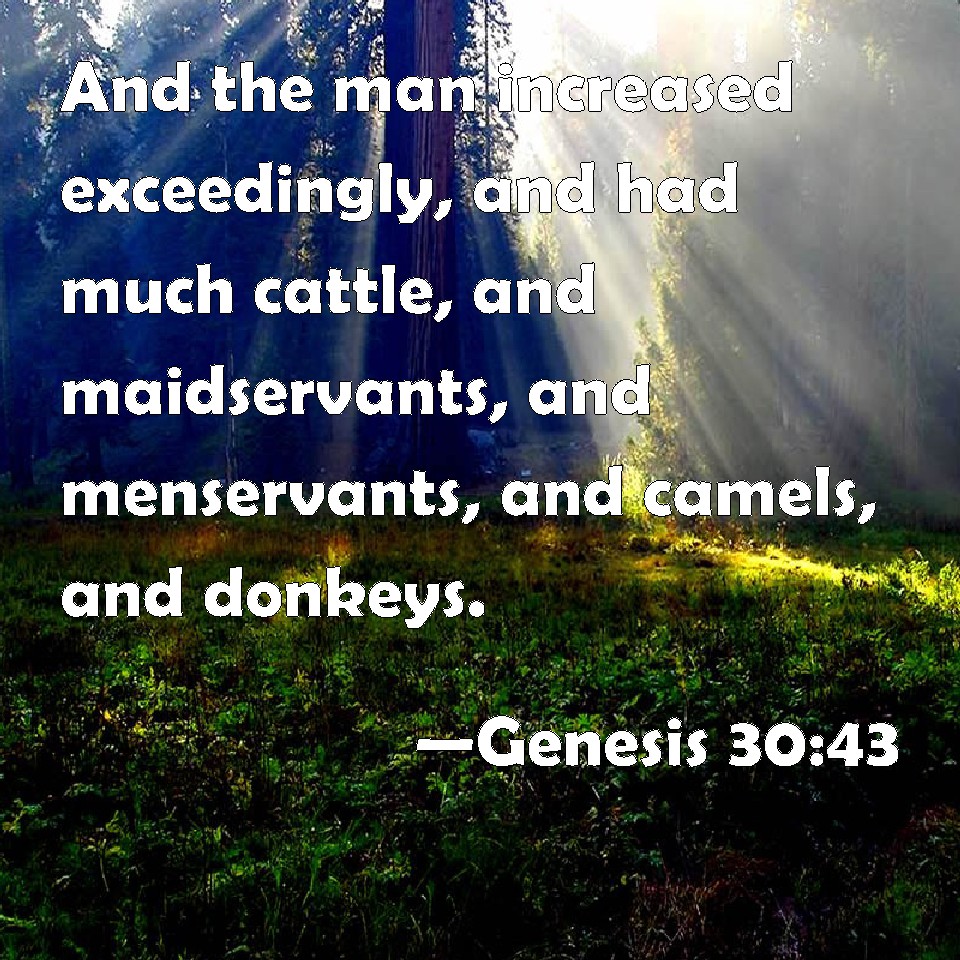 Choose a Background Genesis 30:43 And the man increased exceedingly, and had much cattle, and maidservants, and menservants, and camels, and asses. KJV: And the man increased exceedingly, and had much cattle, and maidservants, and menservants, and camels, and asses. DRB: And the man was enriched exceedingly, and he had many flocks, maid servants and men servants, camels and asses. DBT: And the man increased very, very much, and had much cattle, and bondwomen, and bondmen, and camels, and asses. ERV: And the man increased exceedingly, and had large flocks, and maidservants and menservants, and camels and asses. WBT: And the man increased exceedingly, and had many cattle, and maid-servants, and men-servants, and camels, and asses. WEB: The man increased exceedingly, and had large flocks, female servants and male servants, and camels and donkeys. YLT: And the man increaseth very exceedingly, and hath many flocks, and maid-servants, and men-servants, and camels, and asses.Links Genesis 30:43 NIV • Genesis 30:43 NLT • Genesis 30:43 ESV • Genesis 30:43 NASB • Genesis 30:43 KJV • Genesis 30:43 Interlinear • Genesis 30:43 Commentaries • Genesis 30:43 Parallel Texts • Genesis 30:43 Bible Apps • Genesis 30:43 Parallel • Bible Hub |