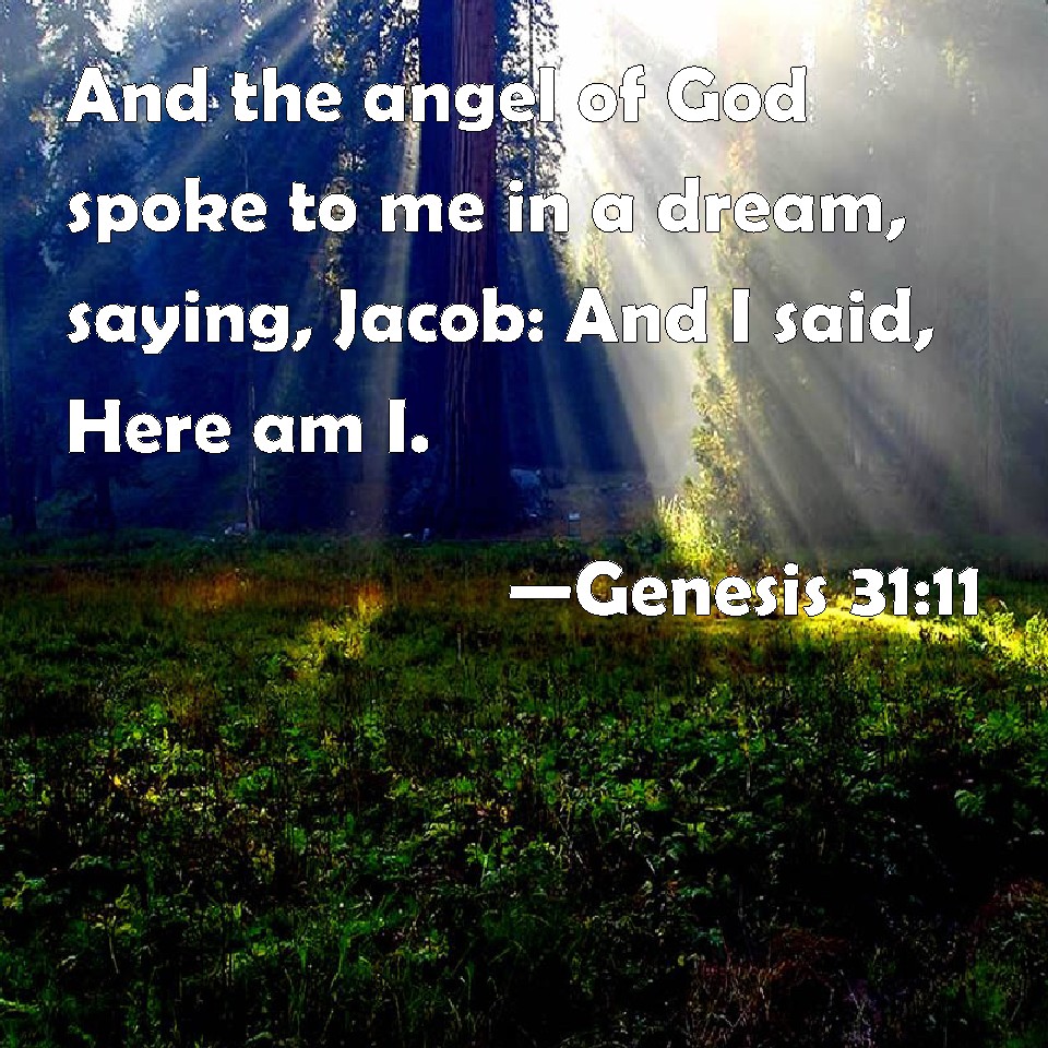 Choose a Background Genesis 31:11 And the angel of God spoke to me in a dream, saying, Jacob: And I said, Here am I. KJV: And the angel of God spake unto me in a dream, saying, Jacob: And I said, Here am I. DRB: And the angel of God said to me in my sleep: Jacob? And I answered: Here I am. DBT: And the Angel of God said to me in a dream, Jacob! And I said, Here am I. ERV: And the angel of God said unto me in the dream, Jacob: and I said, Here am I. WBT: And the angel of God spoke to me in a dream, saying, Jacob: And I said, Here am I. WEB: The angel of God said to me in the dream, 'Jacob,' and I said, 'Here I am.' YLT: and the messenger of God saith unto me in the dream, Jacob, and I say, Here am I.Links Genesis 31:11 NIV • Genesis 31:11 NLT • Genesis 31:11 ESV • Genesis 31:11 NASB • Genesis 31:11 KJV • Genesis 31:11 Interlinear • Genesis 31:11 Commentaries • Genesis 31:11 Parallel Texts • Genesis 31:11 Bible Apps • Genesis 31:11 Parallel • Bible Hub |