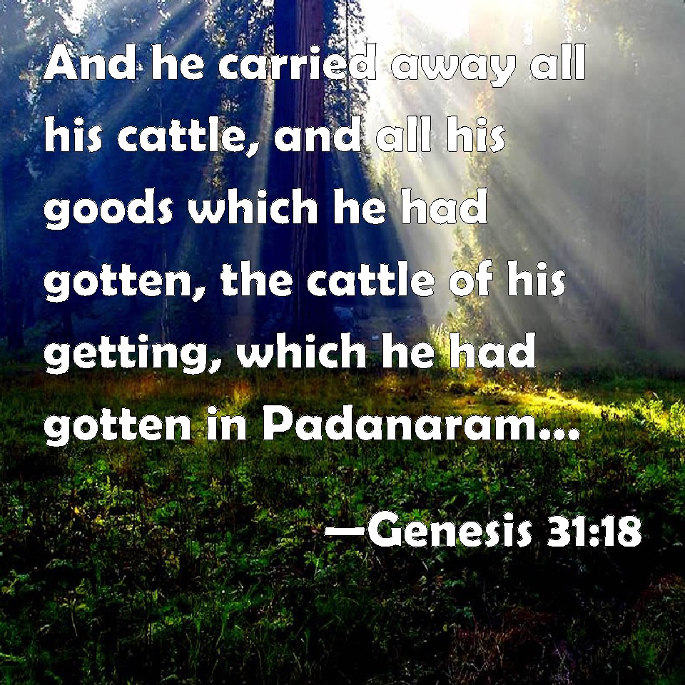 Choose a Background Genesis 31:18 And he carried away all his cattle, and all his goods which he had gotten, the cattle of his getting, which he had gotten in Padanaram, for to go to Isaac his father in the land of Canaan. KJV: And he carried away all his cattle, and all his goods which he had gotten, the cattle of his getting, which he had gotten in Padanaram, for to go to Isaac his father in the land of Canaan. DRB: And he took all his substance, and flocks, and whatsoever he had gotten in Mesopotamia, and went forward to Isaac his father to the land of Chanaan. DBT: and carried away all his cattle, and all his property that he had acquired the cattle of his possessions that he had acquired in Padan-Aram, to go to Isaac his father, into the land of Canaan. ERV: and he carried away all his cattle, and all his substance which he had gathered, the cattle of his getting, which he had gathered in Paddan-aram, for to go to Isaac his father unto the land of Canaan. WBT: And he carried away all his cattle, and all his goods which he had gained, the cattle of his getting, which he had gained in Padan-aram; to go to Isaac, his father, in the land of Canaan. WEB: and he took away all his livestock, and all his possessions which he had gathered, including the livestock which he had gained in Paddan Aram, to go to Isaac his father, to the land of Canaan. YLT: and leadeth all his cattle, and all his substance which he hath acquired, the cattle of his getting, which he hath acquired in Padan-Aram, to go unto Isaac his father, to the land of Canaan.Links Genesis 31:18 NIV • Genesis 31:18 NLT • Genesis 31:18 ESV • Genesis 31:18 NASB • Genesis 31:18 KJV • Genesis 31:18 Interlinear • Genesis 31:18 Commentaries • Genesis 31:18 Parallel Texts • Genesis 31:18 Bible Apps • Genesis 31:18 Parallel • Bible Hub |