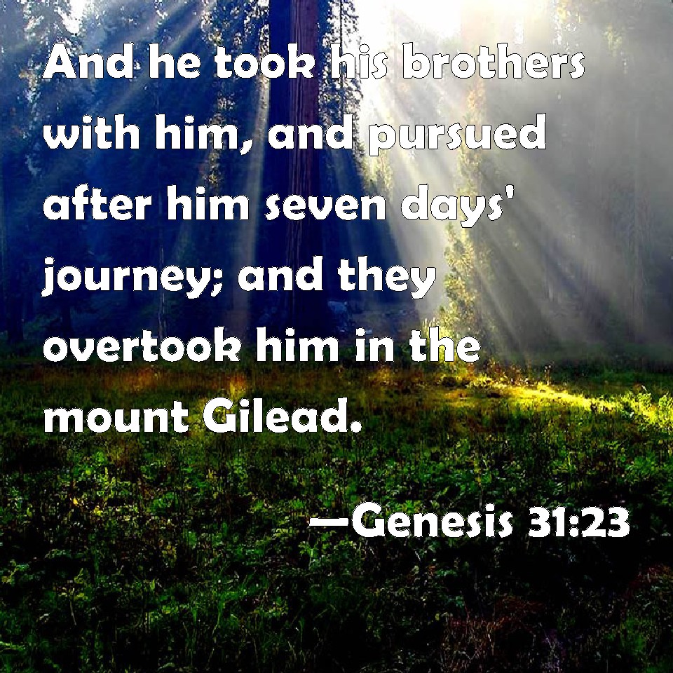 Choose a Background Genesis 31:23 And he took his brothers with him, and pursued after him seven days' journey; and they overtook him in the mount Gilead. KJV: And he took his brethren with him, and pursued after him seven days' journey; and they overtook him in the mount Gilead. DRB: And he took his brethren with him, and pursued after him seven days; and overtook him in the mount of Galaad. DBT: And he took his brethren with him, and pursued after him seven days' journey, and overtook him on mount Gilead. ERV: And he took his brethren with him, and pursued after him seven days' journey; and he overtook him in the mountain of Gilead. WBT: And he took his brethren with him, and pursued after him seven days' journey: and they overtook him in the mount Gilead. WEB: He took his relatives with him, and pursued after him seven days' journey. He overtook him in the mountain of Gilead. YLT: and he taketh his brethren with him, and pursueth after him a journey of seven days, and overtaketh him in the mount of Gilead.Links Genesis 31:23 NIV • Genesis 31:23 NLT • Genesis 31:23 ESV • Genesis 31:23 NASB • Genesis 31:23 KJV • Genesis 31:23 Interlinear • Genesis 31:23 Commentaries • Genesis 31:23 Parallel Texts • Genesis 31:23 Bible Apps • Genesis 31:23 Parallel • Bible Hub |