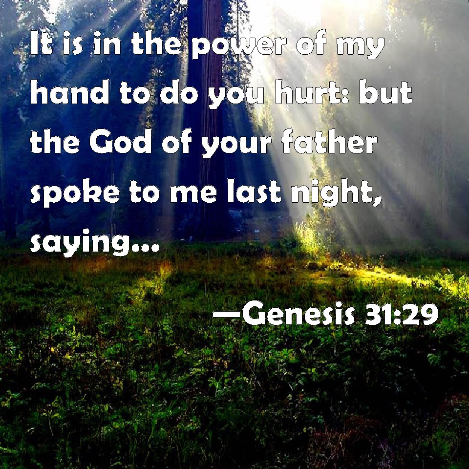 Choose a Background Genesis 31:29 It is in the power of my hand to do you hurt: but the God of your father spoke to me last night, saying, Take you heed that you speak not to Jacob either good or bad. KJV: It is in the power of my hand to do you hurt: but the God of your father spake unto me yesternight, saying, Take thou heed that thou speak not to Jacob either good or bad. DRB: It is in my power to return thee evil: but the God of your father said to me yesterday: Take heed thou speak not any things harshly against Jacob. DBT: It would be in the power of my hand to do you hurt; but the God of your father spoke to me last night, saying, Take care that thou speak not to Jacob either good or bad. ERV: It is in the power of my hand to do you hurt: but the God of your father spake unto me yesternight, saying, Take heed to thyself that thou speak not to Jacob either good or bad. WBT: It is in the power of my hand to do you hurt: but the God of your father spoke to me yesternight, saying, Take thou heed that thou speak not to Jacob either good or bad. WEB: It is in the power of my hand to hurt you, but the God of your father spoke to me last night, saying, 'Take heed to yourself that you don't speak to Jacob either good or bad.' YLT: my hand is to God to do evil with you, but the God of your father yesternight hath spoken unto me, saying, Take heed to thyself from speaking with Jacob from good unto evil.Links Genesis 31:29 NIV • Genesis 31:29 NLT • Genesis 31:29 ESV • Genesis 31:29 NASB • Genesis 31:29 KJV • Genesis 31:29 Interlinear • Genesis 31:29 Commentaries • Genesis 31:29 Parallel Texts • Genesis 31:29 Bible Apps • Genesis 31:29 Parallel • Bible Hub |